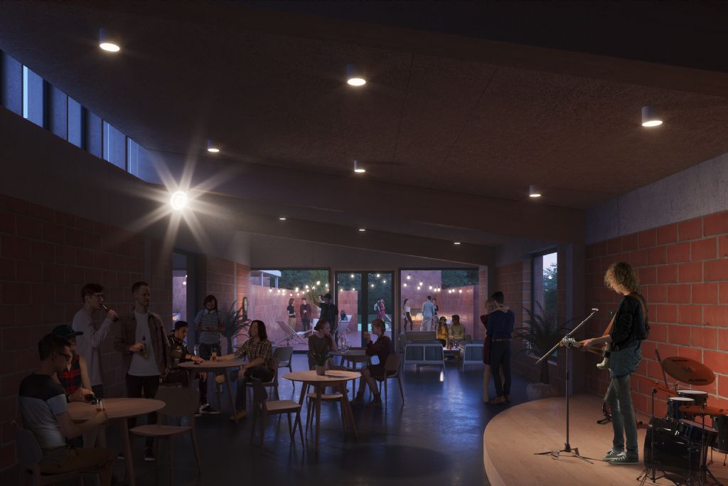 Ook het jeugdhuis is allesbehalve een donkere zaal, met de ramen in de sheddaken en de raampartij achteraan die daglicht naar binnen trekken. “Het jeugdhuis speelt in op de agora, maar we willen hier ook een introverte buitenplaats introduceren met een schouw en haardelementen langs beide zijden”, zegt Nicolas Plovie.