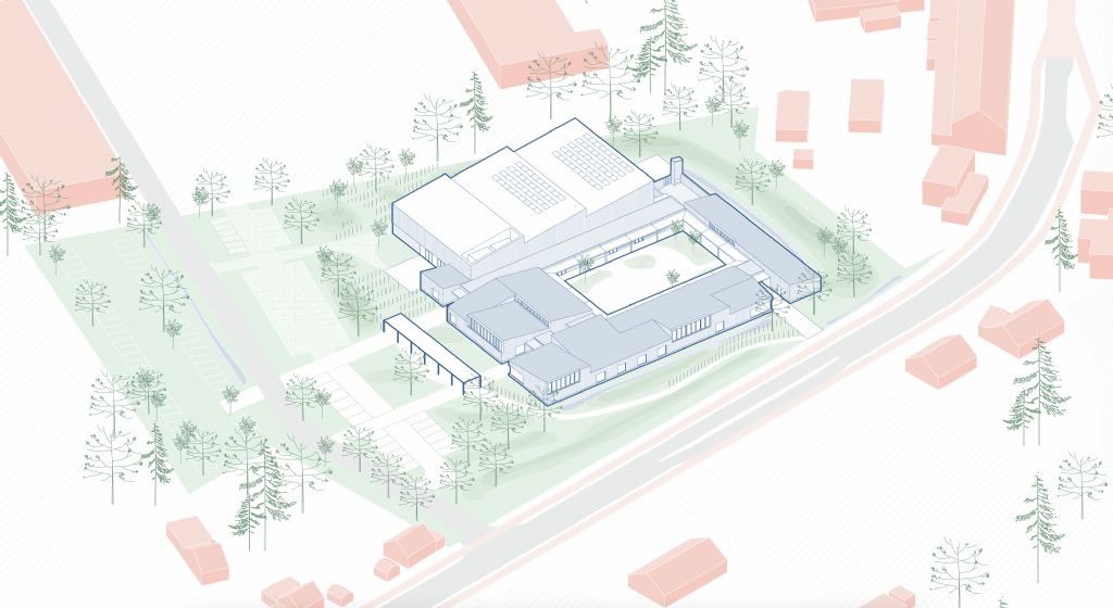 De nieuwe vrijetijdssite voor Sint-Katelijne-Waver is gelegen op wandelafstand van de gemeentekern en wordt begrensd door een woonlint vooraan en een kmo-zone achteraan. “Om stedenbouwkundig in te spelen op deze context hebben we de diversiteit aan functies vertaald in vier aparte bouwvolumes, kleinschaliger en met herkenbare dakvormen in lijn met het woonlint vooraan, grootschaliger met de evenementenhal richting de kmo-zone”, vertellen Thomas Delauré, Vincent Nulens en Nicolas Plovie van LAVA architecten.