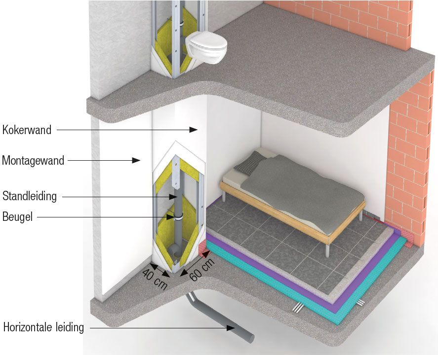We willen erop wijzen dat specifieke akoestische maatregelen veelal overbodig zijn wanneer ervoor gezorgd wordt dat de leidingkokers niet aan geluidsgevoelige ruimten grenzen. Indien dit architecturaal niet mogelijk is, dient men het aantal schachtzijden die aan deze ruimten palen, te beperken, bijvoorbeeld door de schacht in een hoek van de ruimte of in een aangrenzende ruimte te plaatsen.