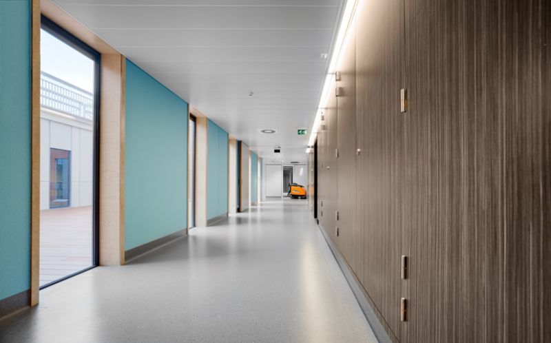 Circulatiemogelijkheden zijn cruciaal in ziekenhuizen, vaak bedraagt de breedte van een gang in een hospitaal daarom drie meter. Zo ook in nieuwbouwfase 4a in UZ Leuven waarvoor LCC-Plafonds de vraag kreeg om een zelfdragende plafondoverspanning tot drie meter te leveren, voor een oppervlakte van 6.000 m2. “Naar montage toe is het moeilijk om verschillende ophangpunten te plaatsen omdat ziekenhuisplafonds een karrenvracht aan technieken herbergen,” vertelt Peter Legrand, key account manager bij LCC-Plafonds. “Daarom is door de ontwerper gekozen voor een bepaald systeem waar wij met onze zelfdragende XL 300-panelen op Omega Hook W-randprofielen met schaduwvoeg perfect aan voldoen.” Volgens architect Filip Deschryver van AR-TE was ook de bouwheer in de ontwerpfase meteen overtuigd van dergelijke oplossing. “De panelen staan garant voor een vlotte toegang tot het plafond, wat een belangrijk aspect is met het oog op onderhoud in de toekomst. Voorts kan je technieken quasi naadloos integreren in dergelijke plafonds.”