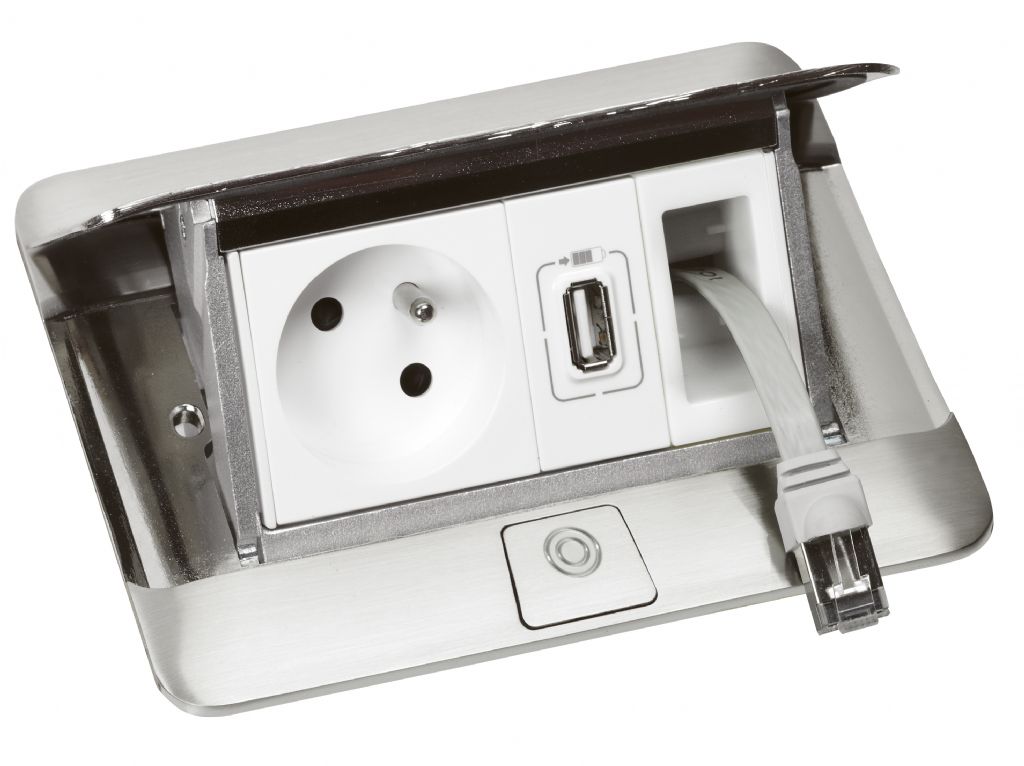 De meervoudige tafelcontactdozen van Legrand koppelen functionaliteit en esthetiek. De elegante verticale contactdoos is beschikbaar in wit/grijze en zwarte afwerking, en past in het interieur van elk kantoor. Meervoudig betekent hier 4 x 2P+A, te bedienen met één centrale schakelaar, en een sokkel met één USB- en één micro USB-lader. De kolom kan om haar as draaien, heeft een geïntegreerde beveiliging tegen overspanning en wordt geleverd met 2 meter snoer (3G 1,5 mm²).