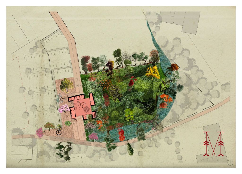 Het eerste concept kwam voort uit de studie van de plattegrond van het Engelse kasteel, een centrale open ruimte met logistieke kamers in de dikke muur errond. De dikke muurmassa is een ideale thermische buffer terwijl de natuur op een overweldigende manier het gebouw binnendringt.