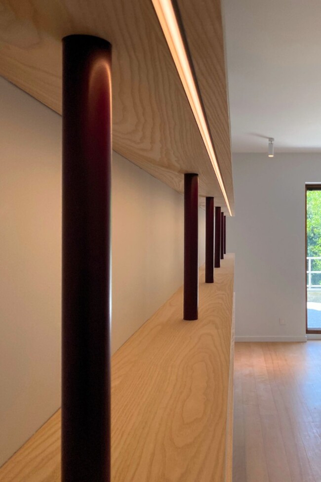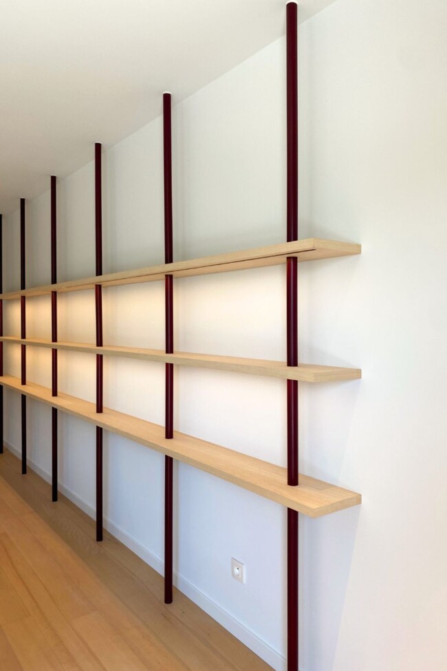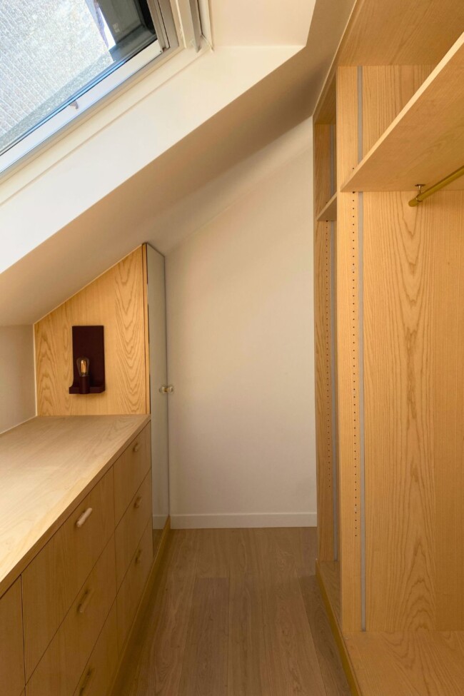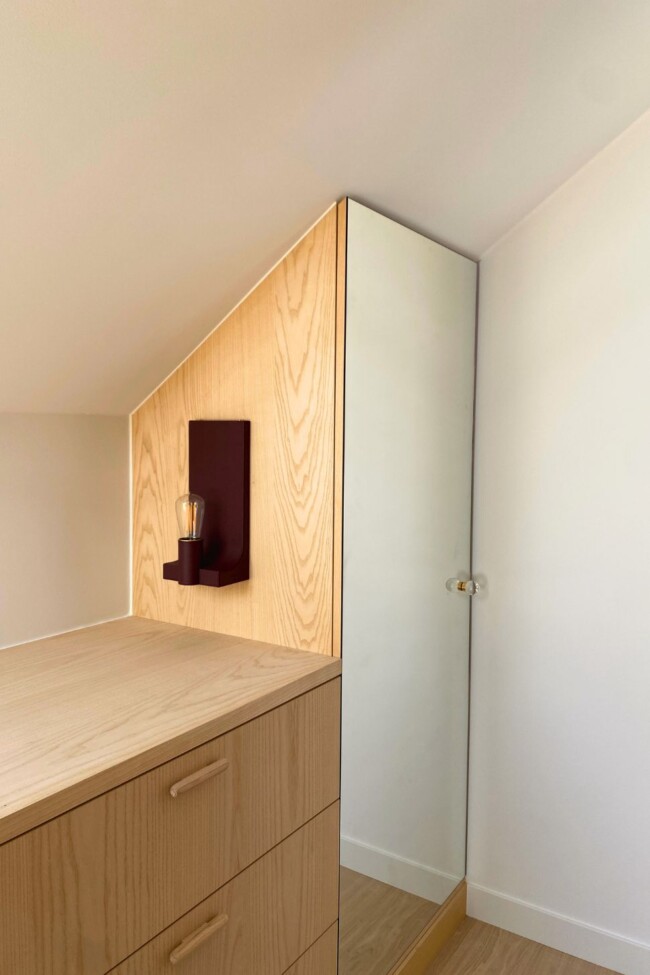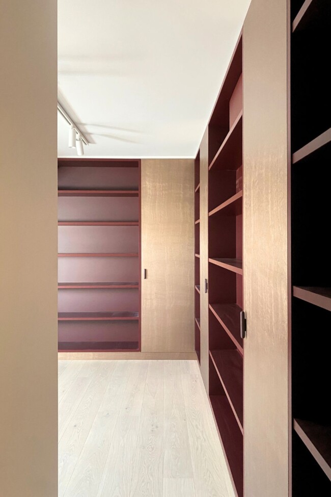 Die dressing is uitgewerkt in es, een houtsoort die doorheen het hele appartement terugkomt. Het materiaal introduceert warmte zonder zwaar te worden en vormt een constante in het project. Accenten in bordeaux, onder meer in de verlichting, zorgen voor een subtiel contrast en keren later terug in andere ruimtes, waardoor een visuele continuïteit ontstaat.