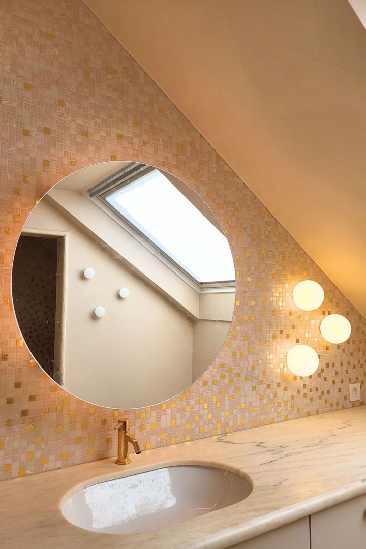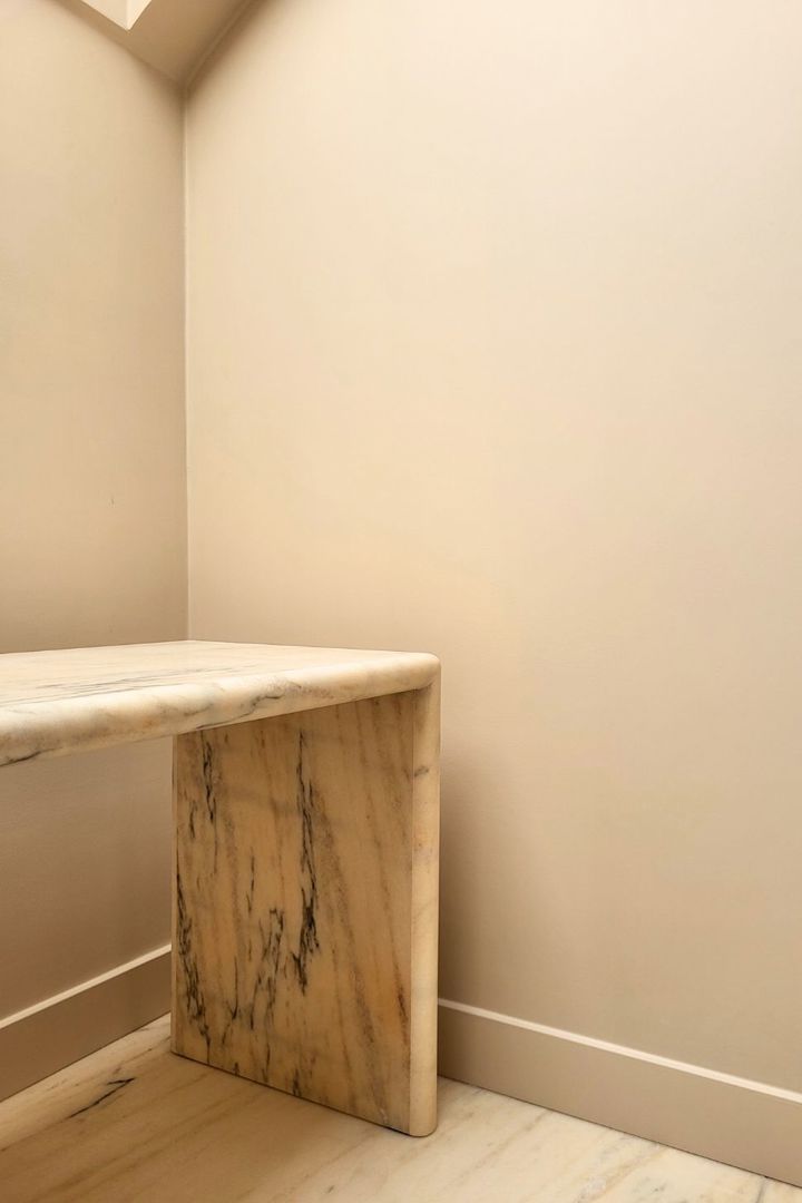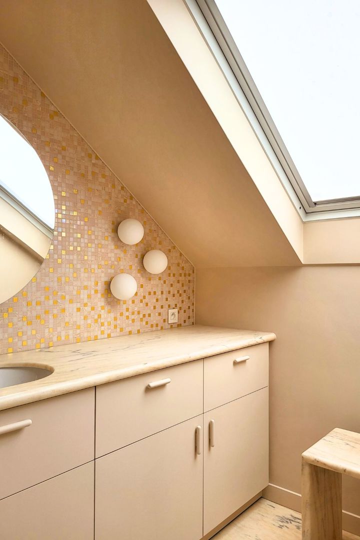 De renovatie ging gepaard met een grondige technische update: alle installaties werden vernieuwd en beide badkamers volledig hertekend. Wat voordien compact en weinig uitgesproken was, maakt plaats voor ruimtes met meer adem en een duidelijke materialiteit. Vooral de masterbadkamer krijgt een uitgesproken karakter, met een roos-goudkleurige mozaïek, natuursteen en zachte tinten die het licht warm reflecteren.