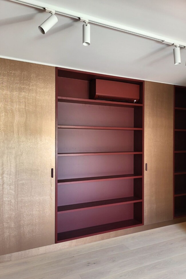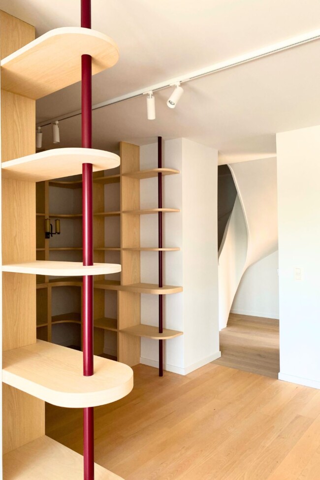 Ook hier zet de zachte vormentaal zich door. Ronde lijnen en afgeronde hoeken temperen de strengheid van het maatwerk en zorgen voor een vloeiende overgang tussen de verschillende elementen. Bordeaurode accenten, onder meer in kolommen en details, verankeren de ruimte en leggen verbanden met andere delen van het appartement.