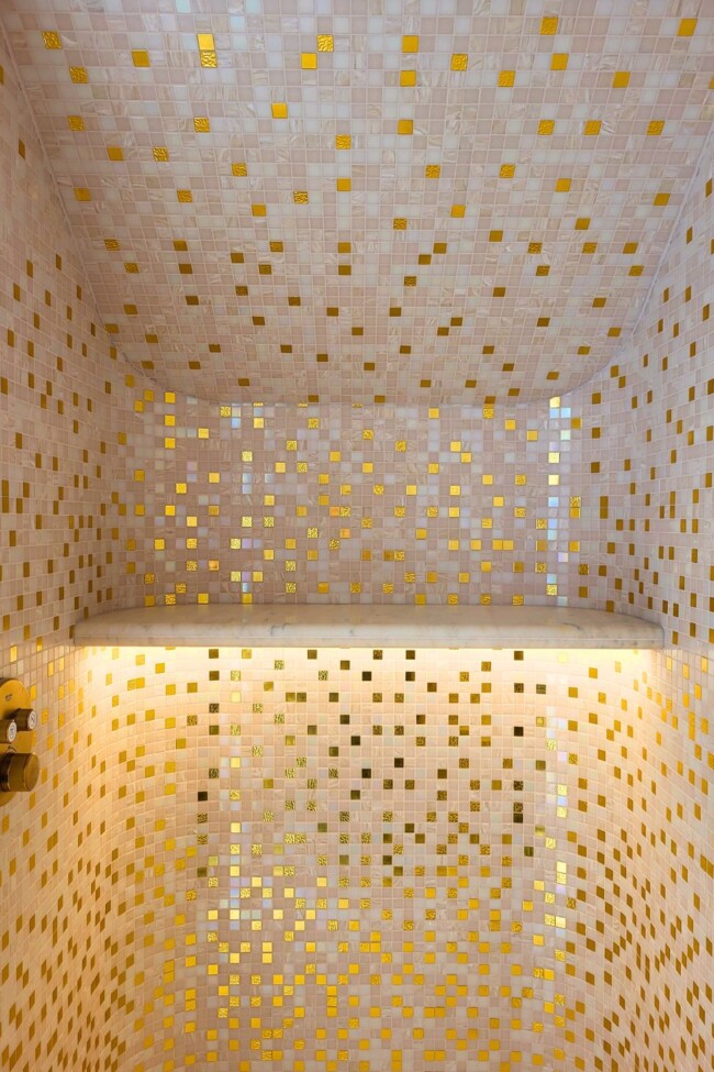 De detaillering speelt hier een belangrijke rol. Verlichting wordt niet enkel functioneel ingezet, maar versterkt de materialiteit, zoals onder het legtablet in de douche waar licht de mozaïek subtiel laat oplichten. Ook de vormentaal is consequent: afgeronde hoeken keren terug in nissen, randen en accessoires, waardoor de ruimte een rustige samenhang krijgt zonder statisch te worden.