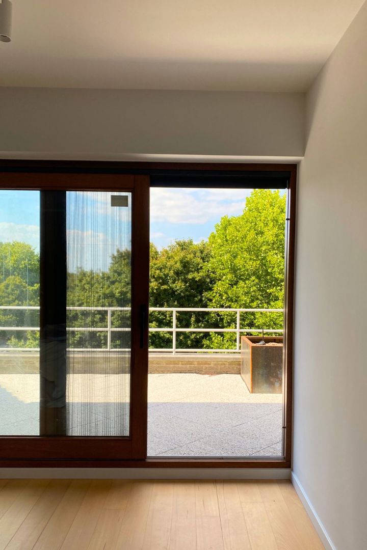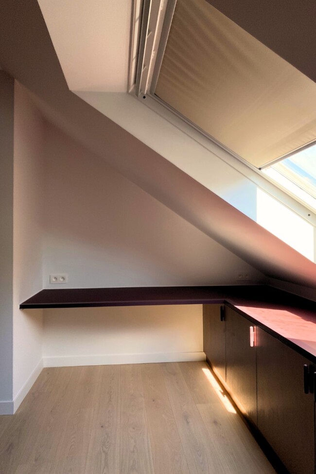 Dat principe wordt verder doorgetrokken in de bureaukamer, waar gesloten kasten in een Homapal-afwerking worden gecombineerd met open structuren in bordeaux. Doorheen het appartement ontstaat zo een consistent palet van materialen en kleuren, waarin es, natuursteen en zachte roze tinten worden aangevuld met gerichte accenten. De relatie met de omgeving blijft daarbij voelbaar: de dagelijkse tocht langs de Schelde vertaalt zich in een interieur dat rust en samenhang uitstraalt.