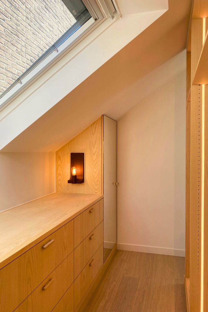 Op de verdieping zorgt een hertekening van de slaapkamer voor meer structuur. Waar voordien één grote, ongedefinieerde ruimte lag, wordt nu een duidelijke scheiding gemaakt tussen slapen en opbergen. De toevoeging van een dressing brengt niet alleen functionaliteit, maar geeft ook richting aan de ruimte.