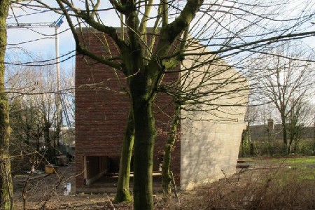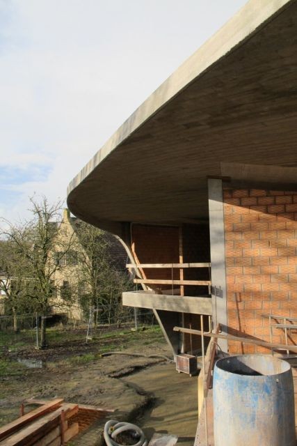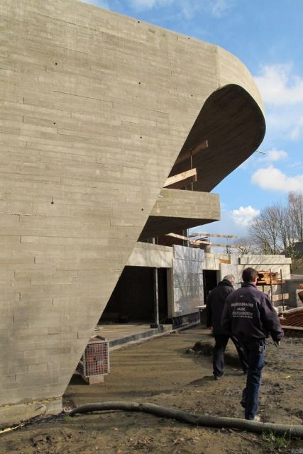Daarom werd een studie gemaakt van de positie van de begroeiing, van de naast- en achterliggende bebouwing en van de oriëntatie en zichtlijnen. Uit deze studie werden vervolgens de planlijnen afgeleid. Het resultaat is een bijna driehoekig gebouw, bedekt met een bladvormig dak dat zoals in de natuur het water geleid opvangt. Toch gaat de woning niet op in de omgeving: het gebruik van bouwmaterialen zoals ruw beton en (gelijmde) baksteen, in combinatie met staal, hout en glas, geven haar een robuuste uitstraling.