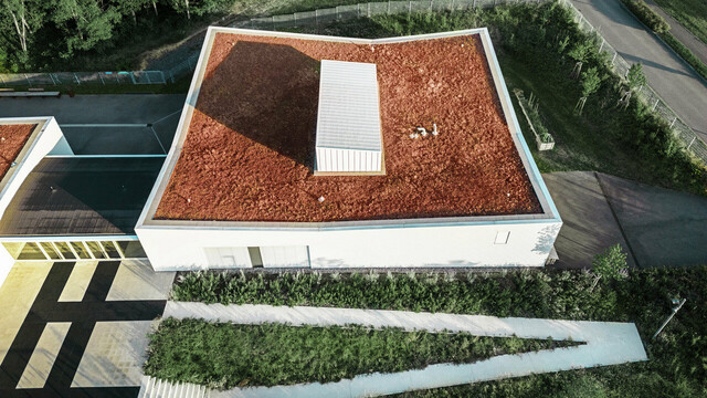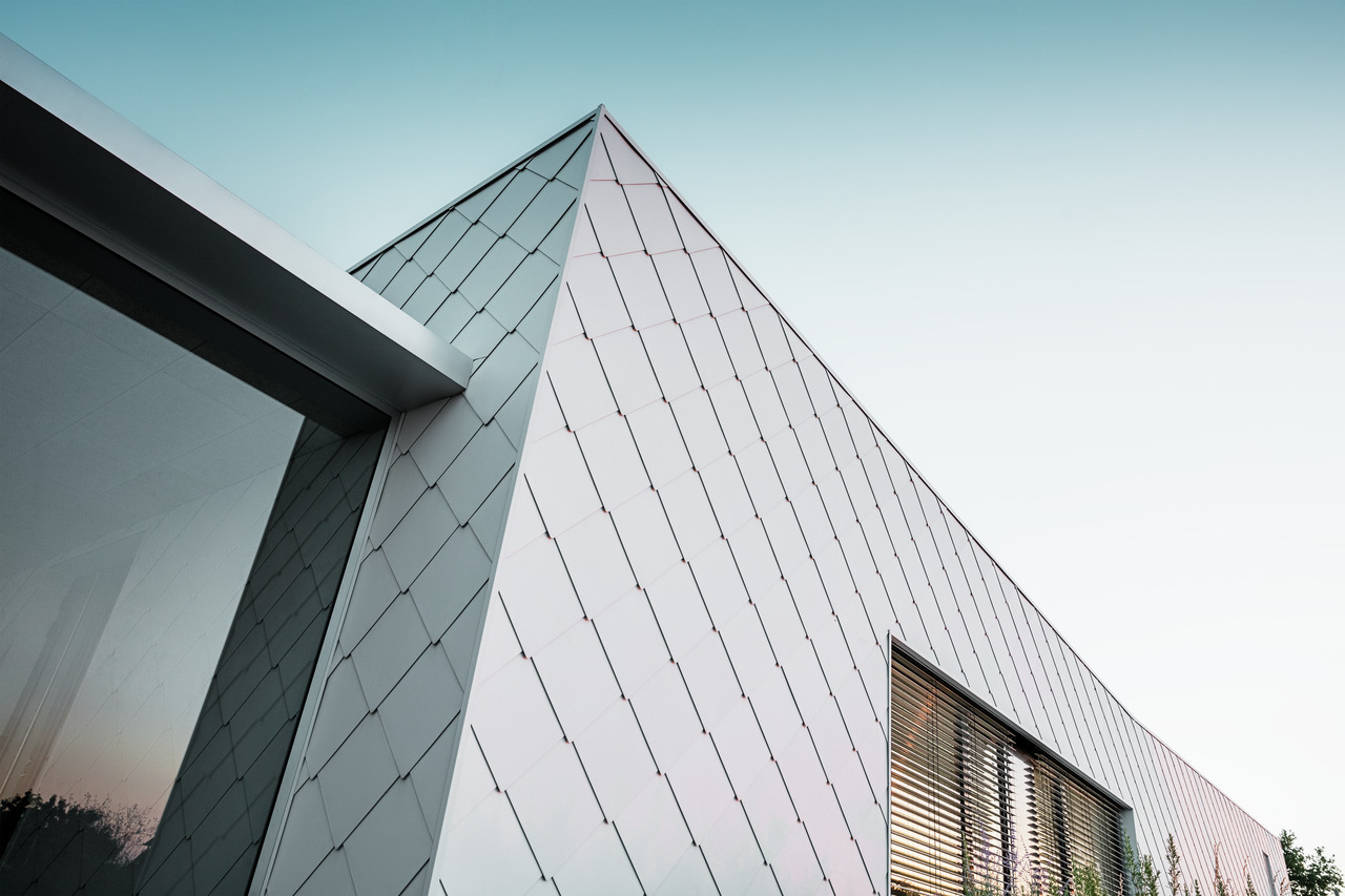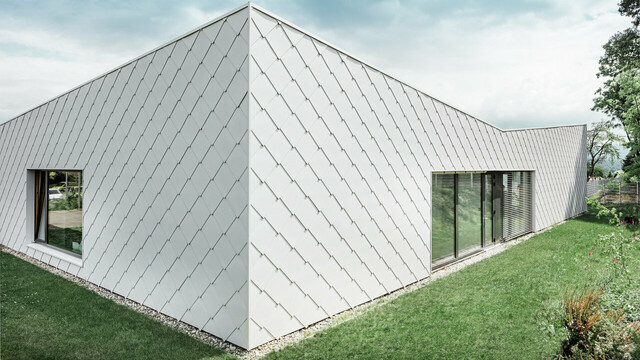 Omdat beide gebouwen niet alleen van elkaar gescheiden zijn, maar ook verschillende gevels hebben, heeft het bureau in Straatsburg ervoor gezorgd dat ze harmonieus bij elkaar passen dankzij een monochroom uiterlijk: Terwijl de basisschool en de kleuterschool bekleed zijn met geglazuurde beverstaarttegels, kozen de architecten voor de naschoolse opvang een lichte ruitvormige gevel van PREFA-aluminium in de kleur P.10 prefawit.