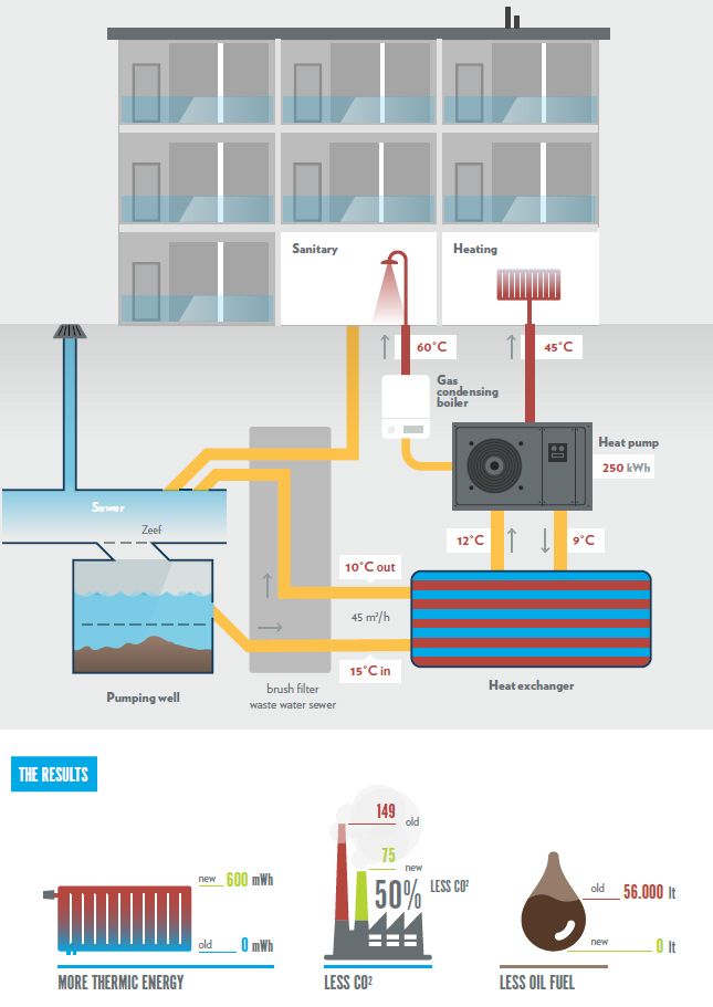 Hoe werkt het? Aan het woningcomplex wordt afvalwater, onder andere van het UZ Gasthuisberg, uit de openbare riolering afgetapt. Een warmtewisselaar brengt de warmte over op het intern circuit, waar een warmtepomp het water verder opwarmt (zie tekening). Blue Heat, dat ook al rioolwarmteprojecten uitvoerde voor de industrie, plaatste de technische installaties. Kumpen plaatste de pompput op het openbaar domein.