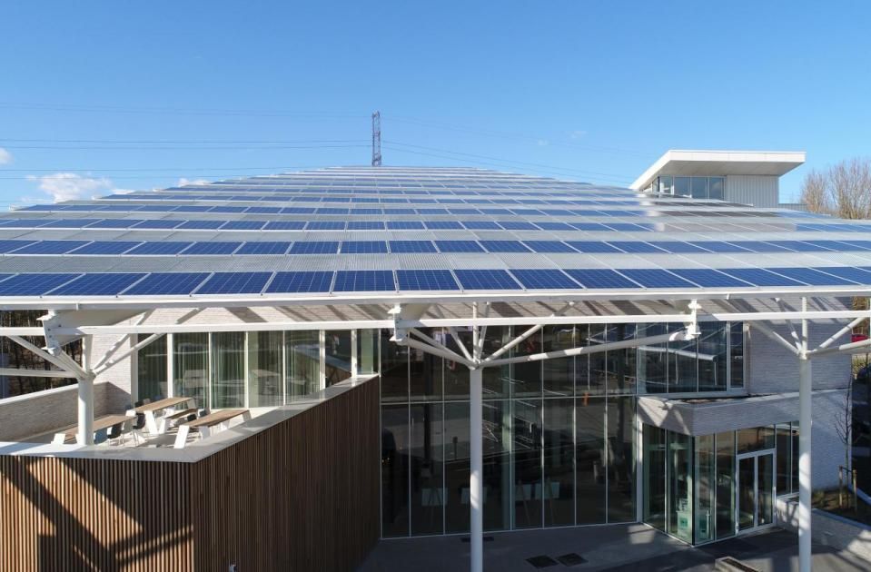 Confederatie Bouw Limburg wilde het innovatieve karakter van het project niet alleen weerspiegeld zien in het uiteindelijke resultaat, maar ook in het bouwproces. Het eiste van de kandiderende consortia een doorgedreven Design & Build-aanpak, een nauwe samenwerking volgens de BIM-methodiek en de toepassing van een kostenefficiënte Lean management-techniek. “Niets zo uitdagend als bouwen voor andere aannemers”, benadrukt Gert Janssen, directeur engineering en ontwikkeling bij Mathieu Gijbels. “Het is een realisatie die met argusogen bekeken werd. De complexiteit schuilde dus eerder in de vereiste uitvoeringskwaliteit dan in het bouwkundige aspect. Qua structuur hebben we geopteerd voor een mix van beton en staal – iets waar iedere aannemer zich in principe wel in kan vinden. De draagconstructie is opgebouwd uit betonnen kolommen en geïntegreerde stalen IFB-liggers (S235 JR) die welfsels ondersteunen. Een betonnen kern met de trappenhal, de liftkern en enkele wanden zorgt voor de stabiliteit. Het geheel is afgewerkt met gecoat metselwerk, hout en glas. De stalen luifel aan de buitenzijde van het gebouw vervult drie functies: architecturale eyecatcher, drager voor de PV-panelen en zonwering van de achterliggende zuidgevel. Hij is samengesteld uit standaard IPE-profielen en ronde buizen (S235), die gegalvaniseerd en in een witte RAL-kleur gelakt zijn.”