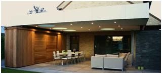 Buitenleven heeft een nieuwe dimensie gekregen. De tuin is een buitenkamer geworden. Mich Veraghtert speelt op deze nieuwe trend in met een totaalconcept voor een terrasontwerp. Het terras kreeg een fraai gestileerd dak voorzien van lichtkoepel voor natuurlijke lichtinval overdag en indirecte verlichting voor ’s avonds. De outdoor kitchen is voorzien van een kitchenette compleet met spoeltafel, koelkast en microgolfoven. Voor een avond ontspanning kunnen de gebruikers ook een beroep doen op een flatscreen tv, allemaal geïntegreerd in een strak wandmeubel dat bijkomende opbergruimte verschaft voor tuinaccessoires en meubelen.