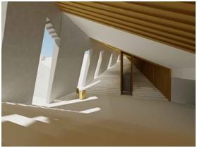 De ruimtes zijn ontworpen op basis van enkele parameters: er is negatief ontwerpen naar vorm, er wordt met andere woorden ruimte uit de massieve blok gehouwen. Voor elke ruimte werd vertrokken van een basisvorm die volgens een bepaald patroon werd gekopieerd, geroteerd, verschoven en verschaald. Een monumentale steeg op straatnivrau biedt een doorgang doorheen de blok. De wanden zijn bekleed met cortenstaal, waardoor ze als ertsader in het betonnen blok worden ervaren. Daglicht valt binnen via de translucente buitenwand.