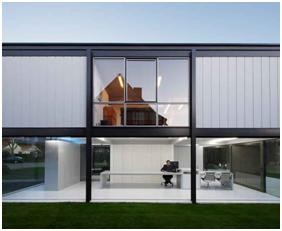 Deze staalbouw woning uit de jaren ’60 werd ontworpen volgens het typische 9-vierkantenrooster. Toen Arjaan De Feyter na jaren van slecht onderhoud de woning aankocht, was ze dringend aan een opknapbeurt toe. Bedoeling was het pand in zijn oorspronkelijke structuur te herstellen en aan te passen aan de hedendaagse noden. In het ontwerp en bij de heropbouw werd rekening gehouden met de verhouding interieur-exterieur, was er aandacht voor licht en lucht, de maatvoering, detaillering en techniek. De buitenwanden op het gelijkvloers werden volledig in glas opgetrokken, losstaand van de bestaande structuur. Verder werden er twee volumes ingeschoven die de ruimte zoneren