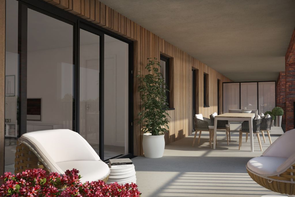 Volgens Van Hoof zijn de ruime terrassen met uitzicht op de tuin de grootste troef van de appartementen. “Ons ontwerp verzekert dat het terras ook echt een leefruimte vormt”, klinkt het. De terrassen hebben een gemiddelde oppervlakte van 34 m2.