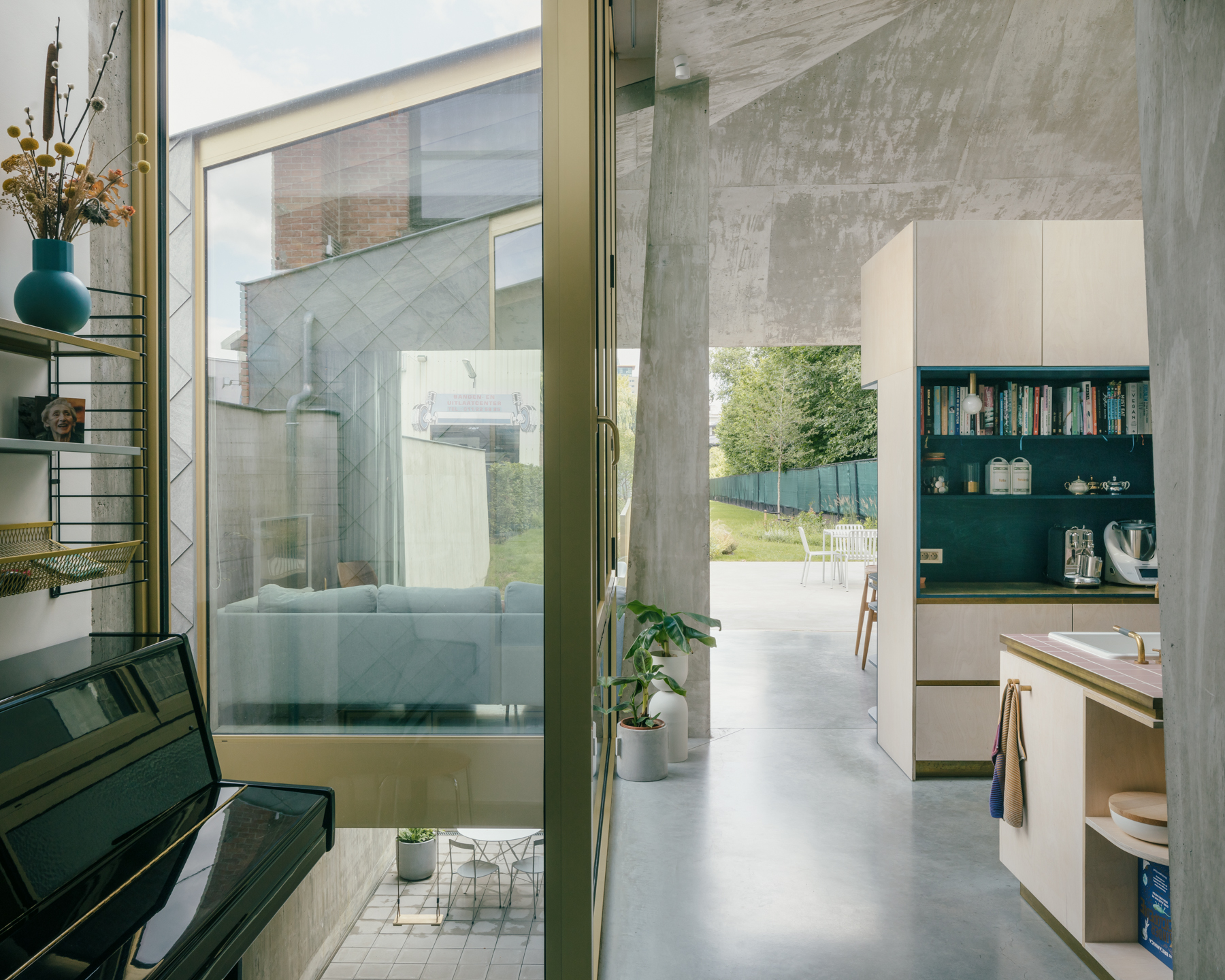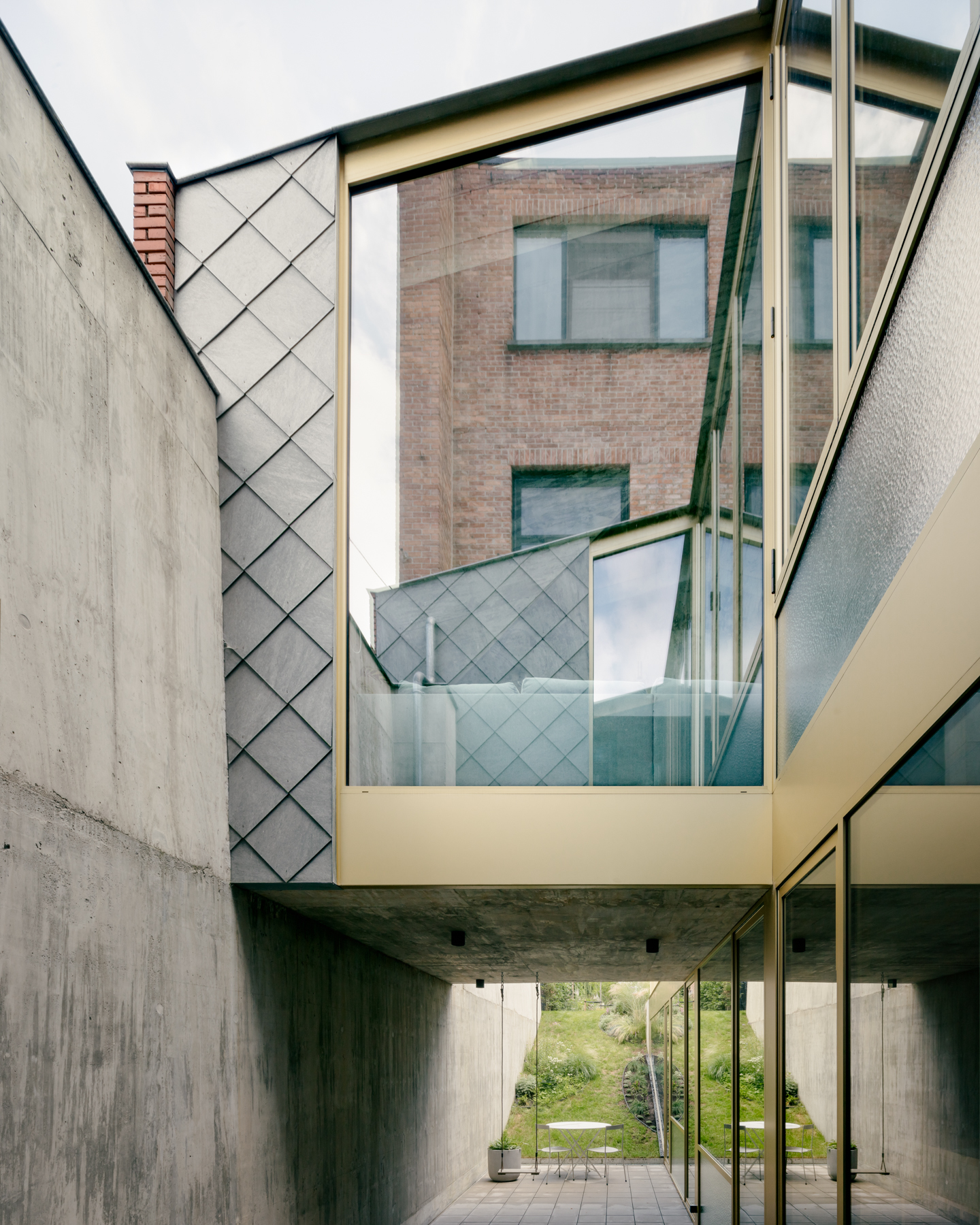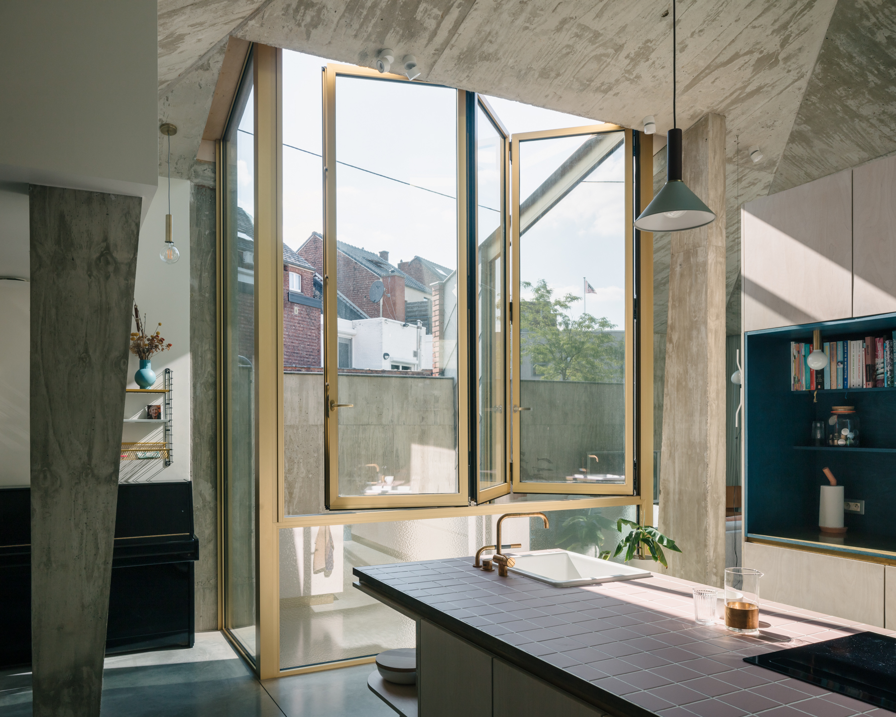 De combinatie van deels ondergronds bouwen met een patio zorgt er niet alleen voor dat er voldoende woonoppervlakte beschikbaar wordt, maar dat dat ook op een heel kwalitatieve manier gebeurt. Ondanks de ingesloten ligging overheerst er nooit een gesloten gevoel in de woning. Licht en lucht regeren in dit huis en dat is allesbehalve evident voor een ingesloten rijwoning op een ietwat vreemde kavel.