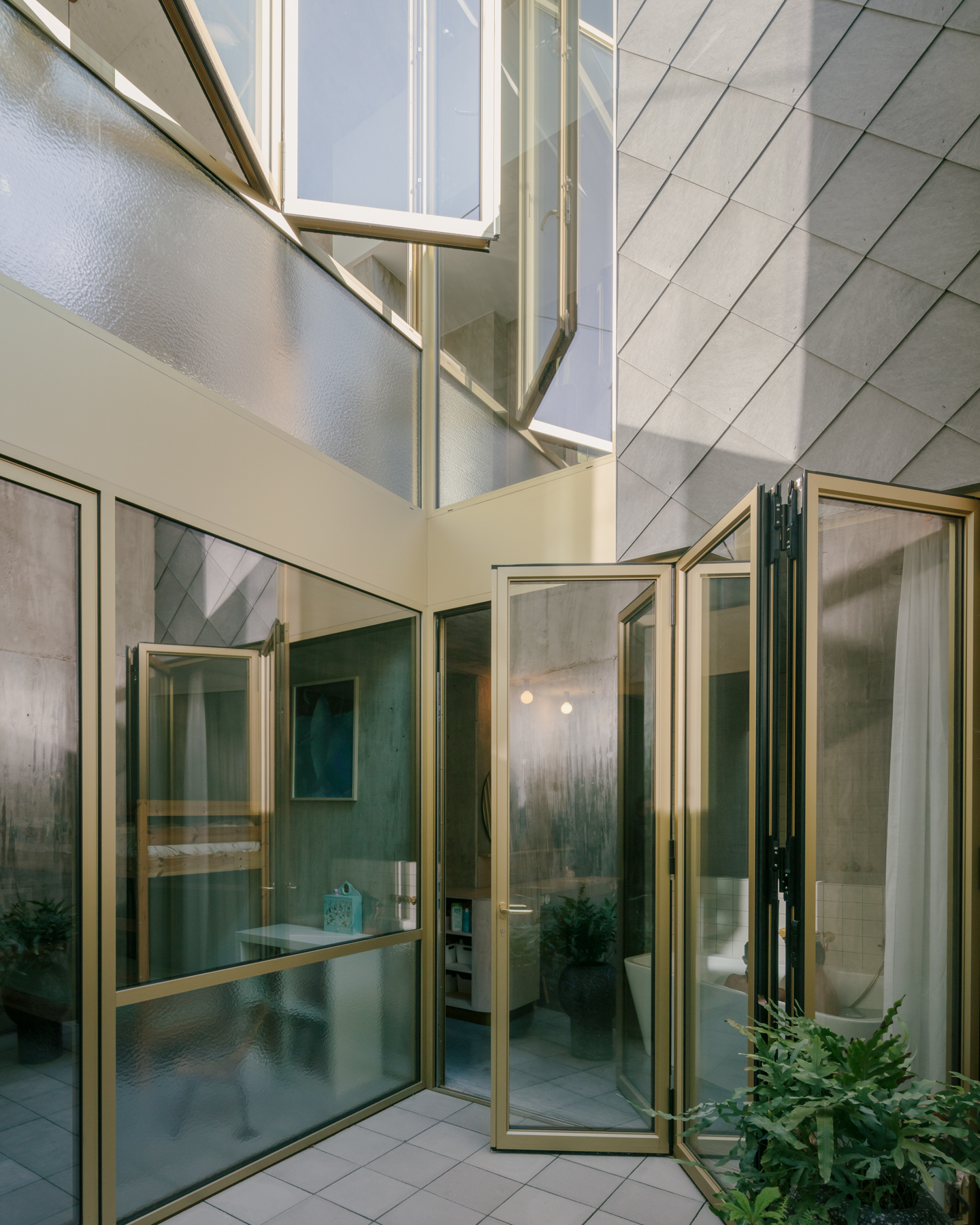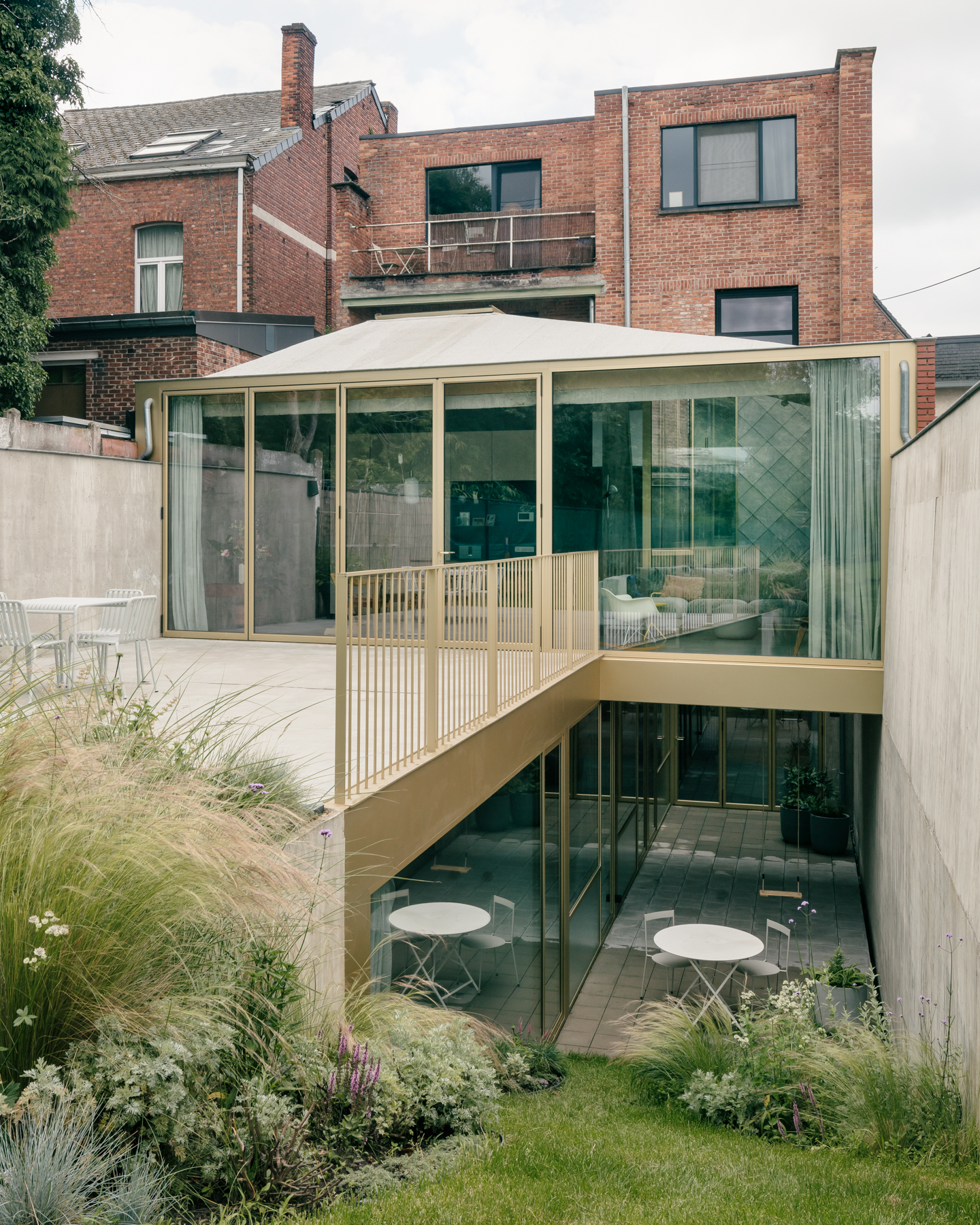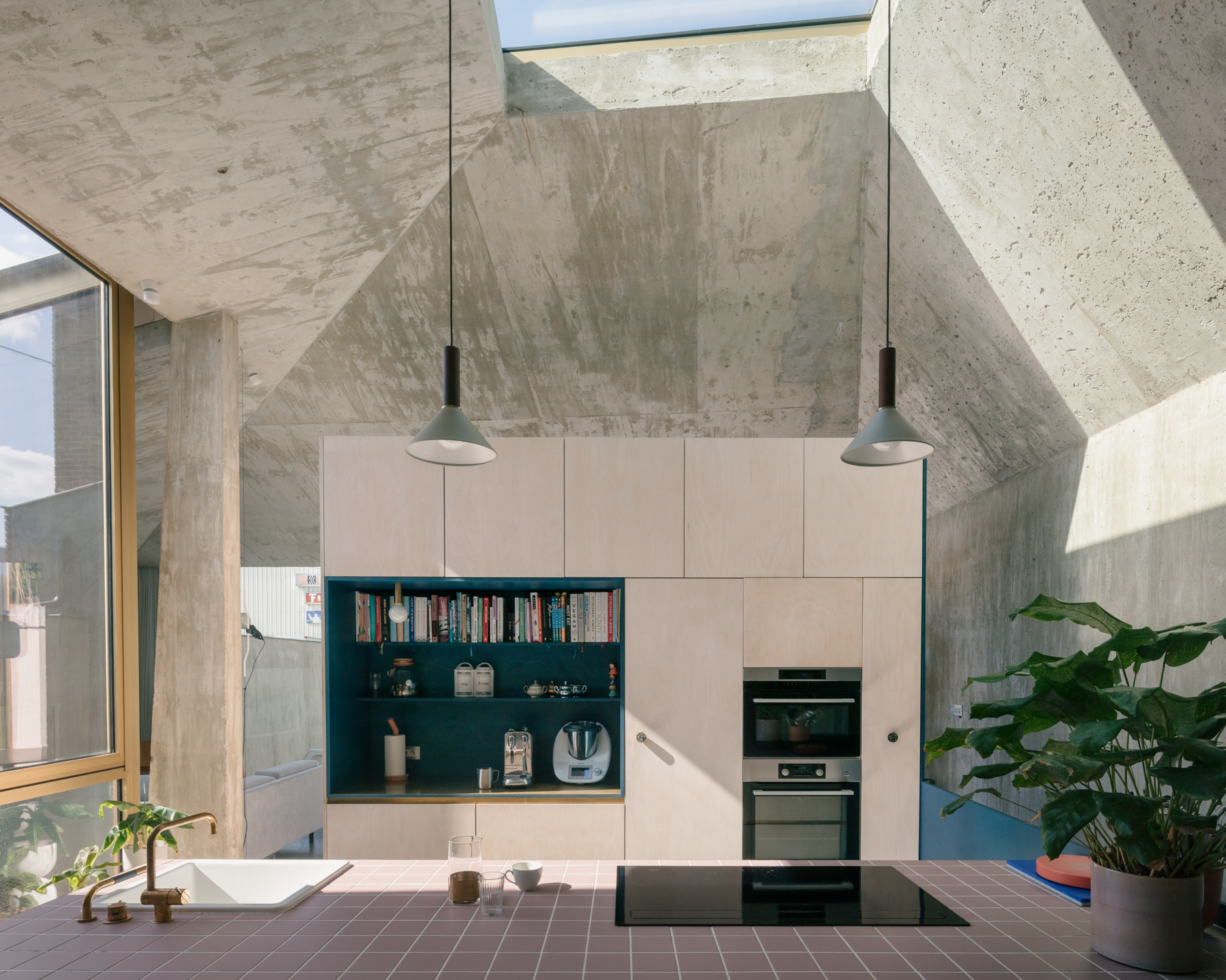 De combinatie van deels ondergronds bouwen met een patio zorgt er niet alleen voor dat er voldoende woonoppervlakte beschikbaar wordt, maar dat dat ook op een heel kwalitatieve manier gebeurt. Ondanks de ingesloten ligging overheerst er nooit een gesloten gevoel in de woning. Licht en lucht regeren in dit huis en dat is allesbehalve evident voor een ingesloten rijwoning op een ietwat vreemde kavel.