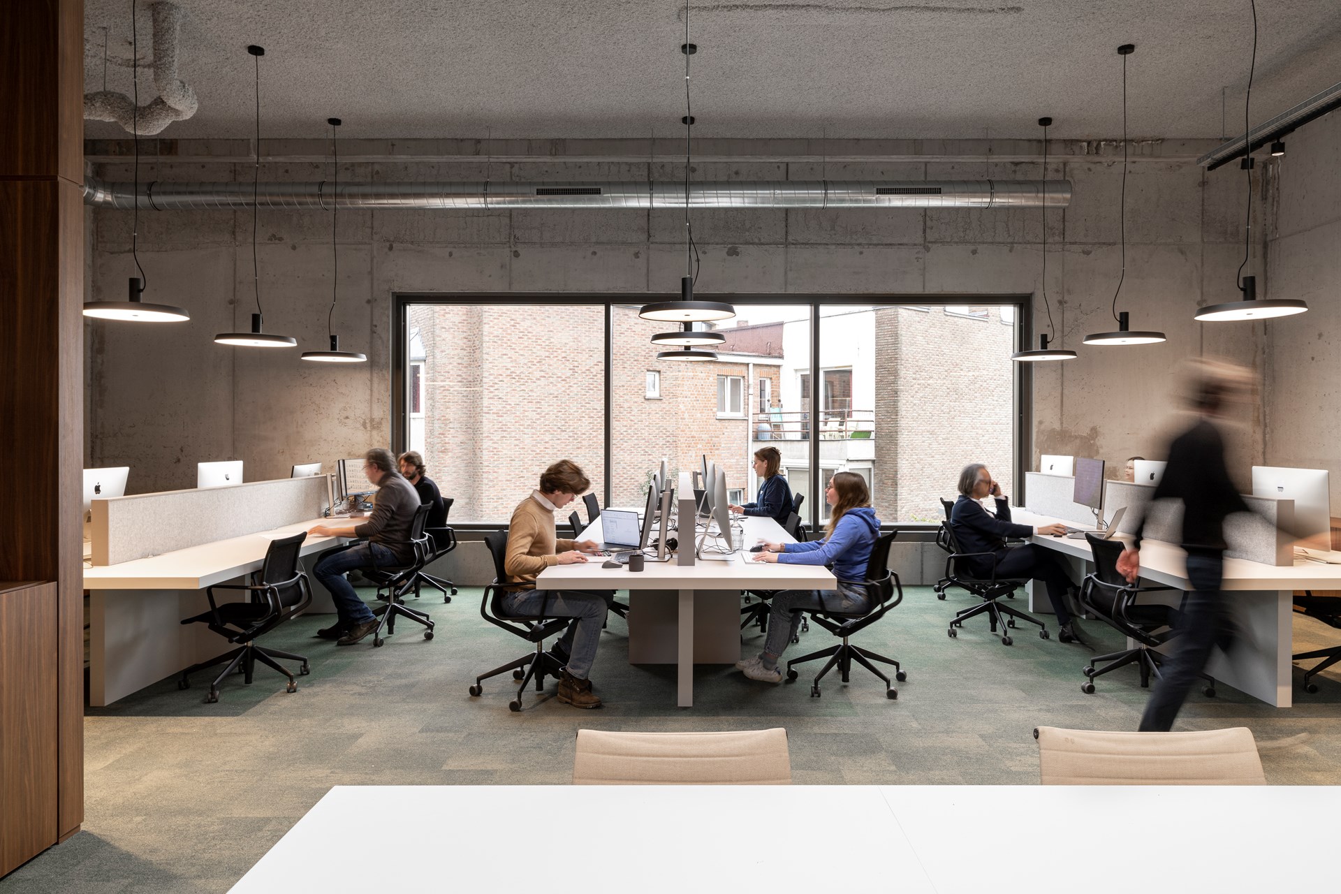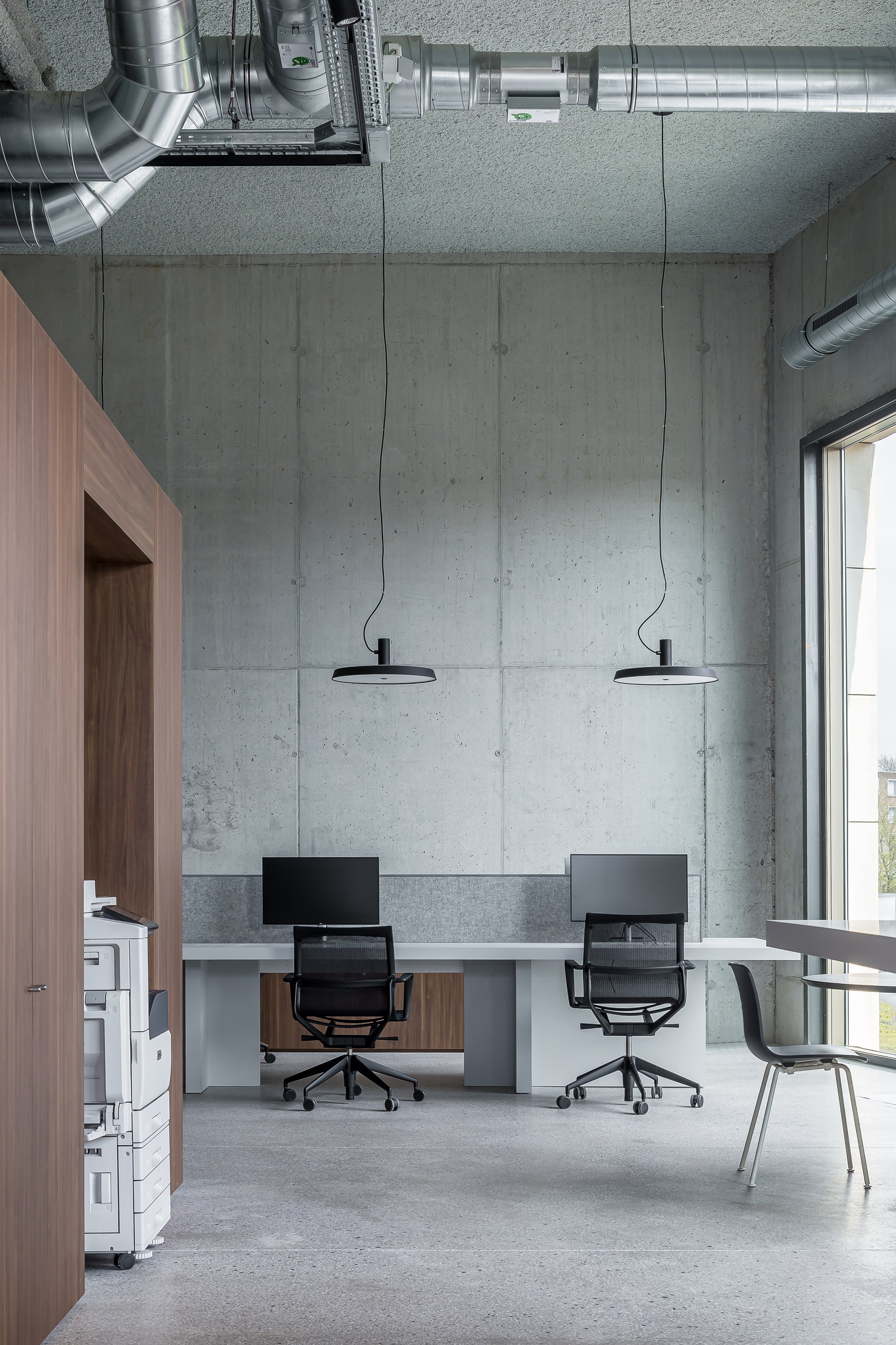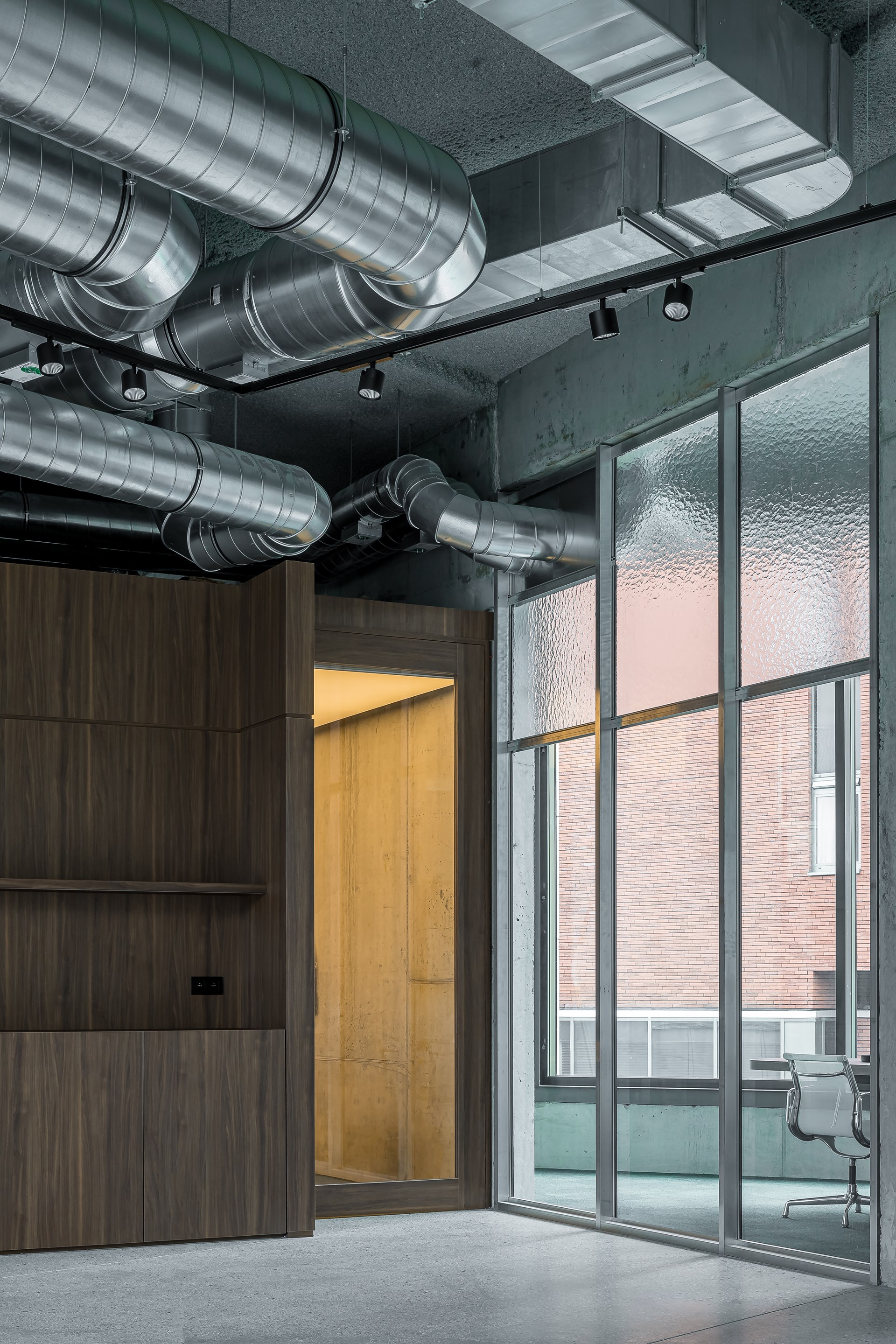 De casco van de ruimte werd zoveel mogelijk behouden. Delen van de muren en plafonds zijn aangekleed met spuitplamuur, om een eenheid te creëren en het ruimtegevoel te vergroten. Ook het feit dat de ventilatiekanalen en andere leidingen doorheen de hele ruimte zichtbaar blijven, draagt bij tot de eenheid.