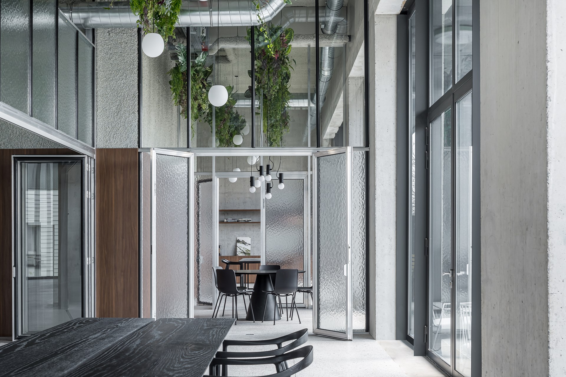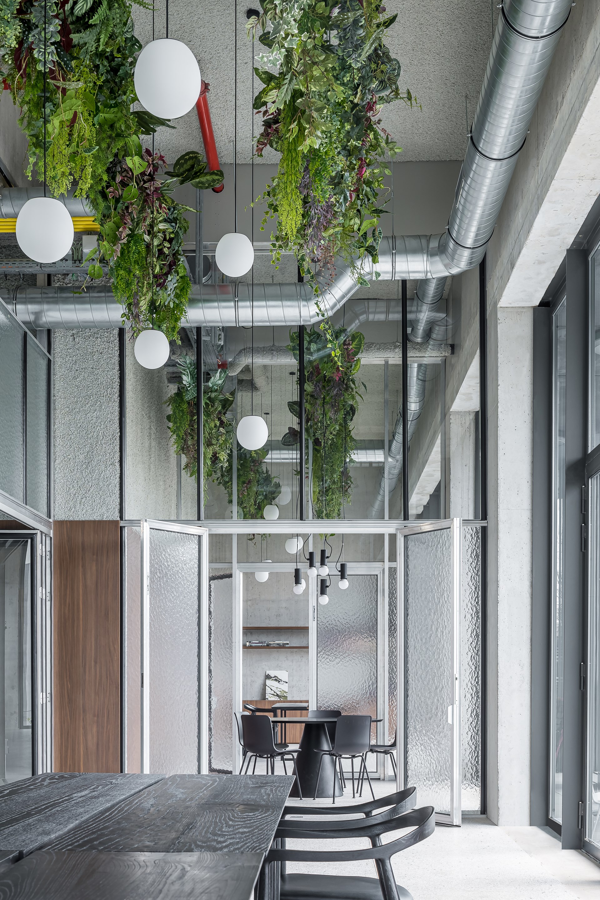 Een minimum afbakening van de ruimtes – nodig voor de privacy van een workshop of een vergadering – is gerealiseerd met een industriële oplossing: transparante wanden en deuren uit de serrebouw. Ook voor de elektrische leidingen koos de interieurdesigner voor een industriële optie. Deze minimale oplossingen zijn ook ingegeven uit ecologische overwegingen.