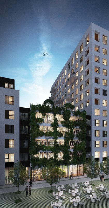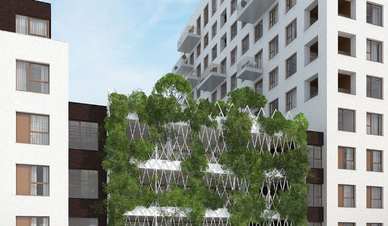 De groene gevel en daken, met intensieve begroeiing, zorgen voor een ruime water buffering en extra thermische en akoestische isolatie.