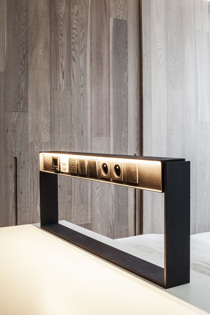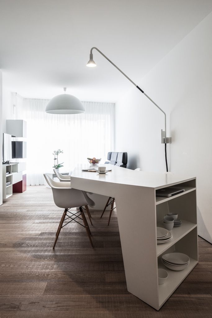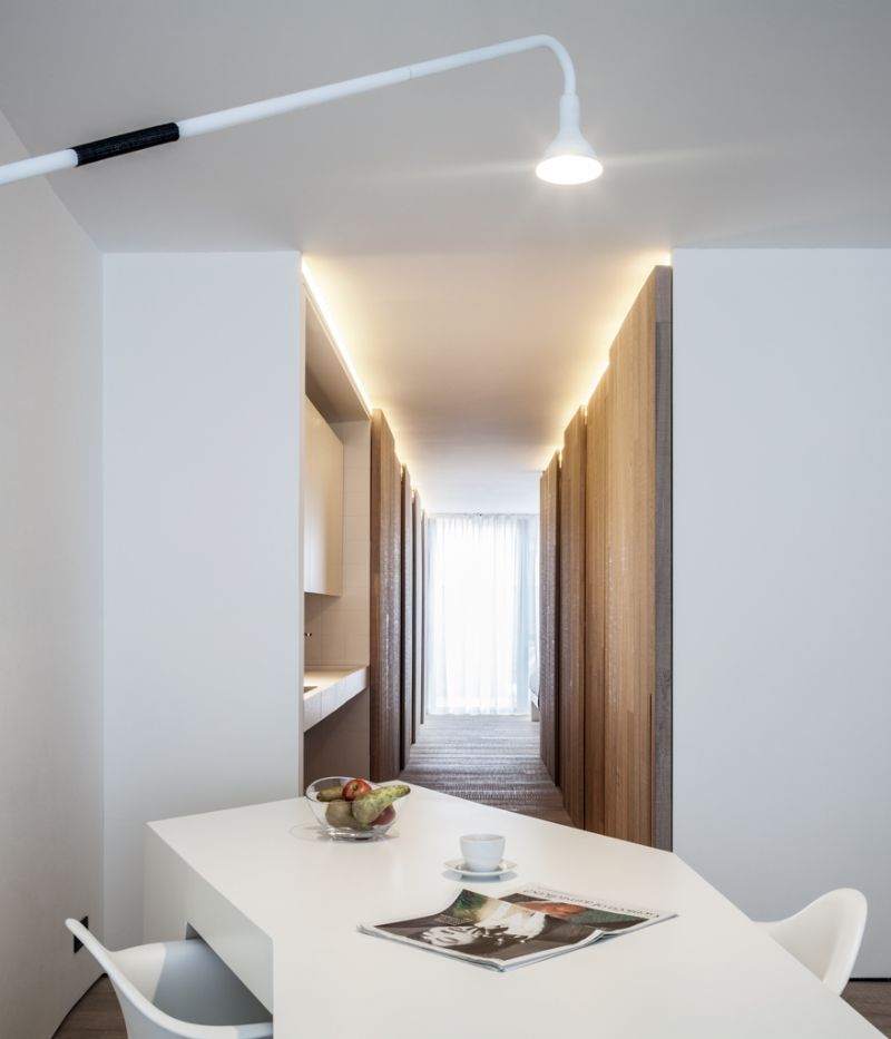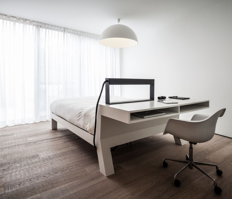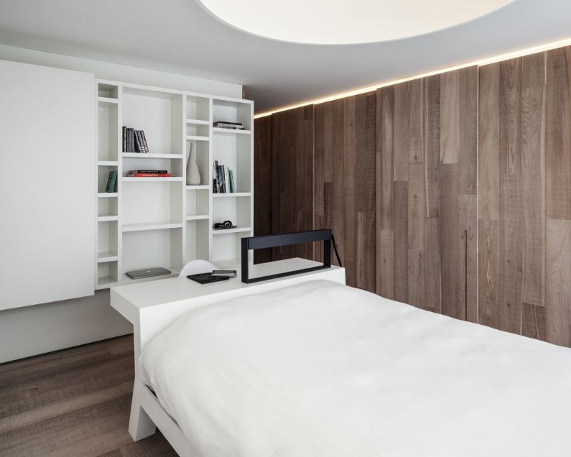 Glazen schuifdeuren leiden van de slaap- en studiekamer naar een klein achtergelegen terras. Witte muren en plafonds zorgen voor een gevoel van rust en verbondenheid. Het meubilair werd volledig aangepast aan de noden van de bewoner. Zo heeft de eettafel ingebouwde rekken en een beweegbare muurlamp. De slaapkamer heeft dan weer een multifunctionele stekkerbox met lamp op een ergonomische hoogte.