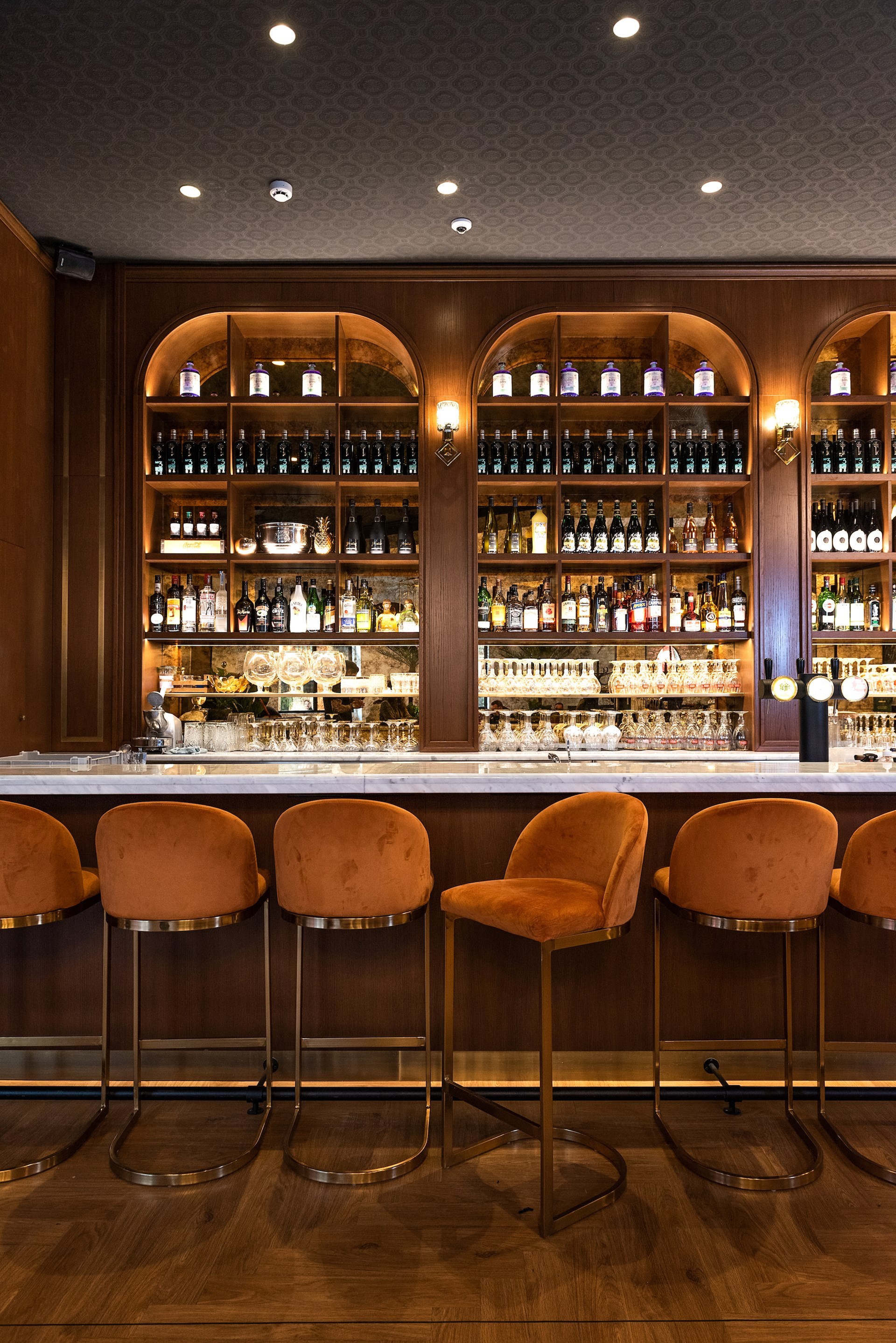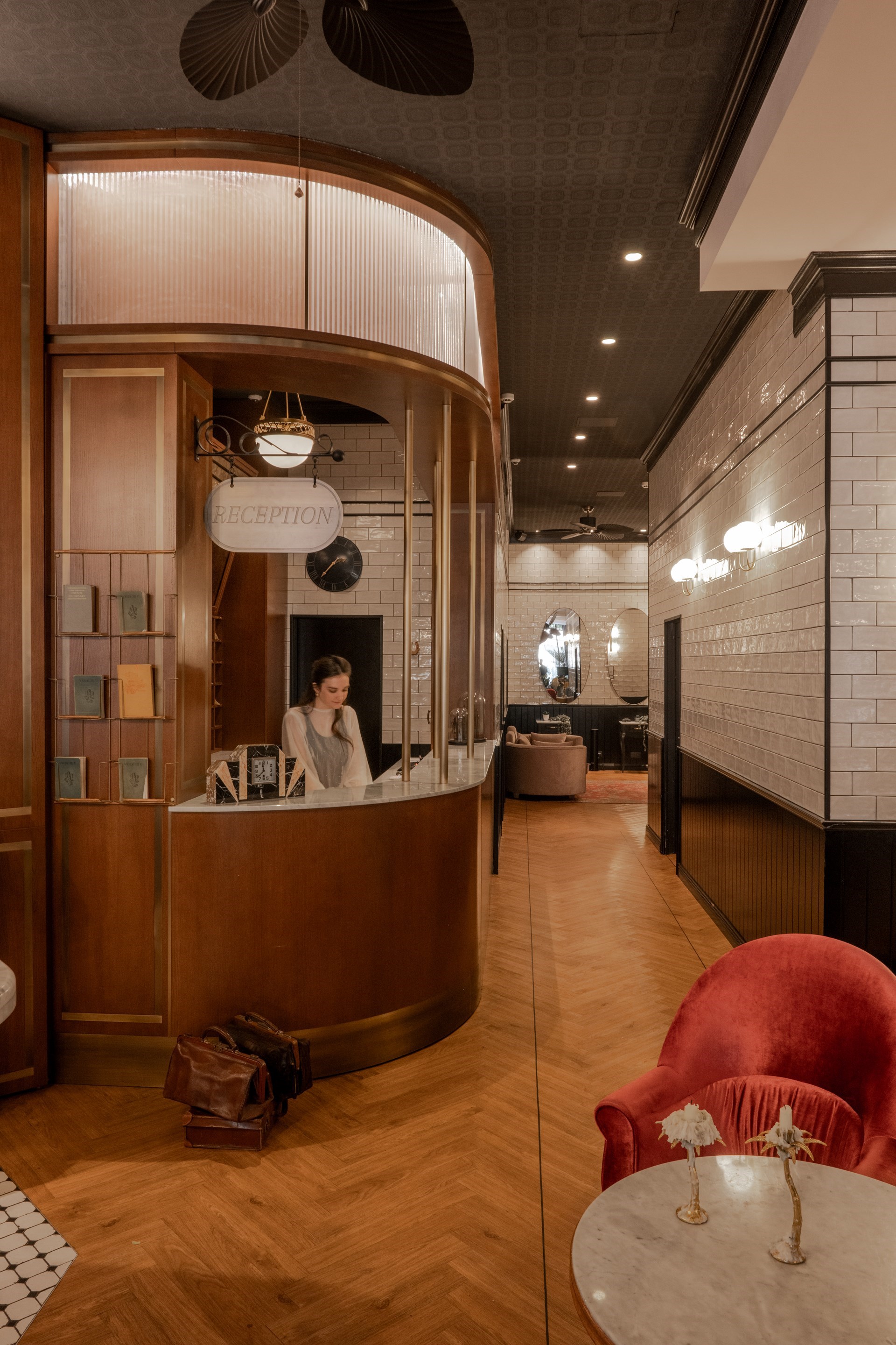 Al meteen bij het binnenkomen worden de hotelgasten ondergedompeld in een unieke sfeer dankzij de imposante bar in hout en marmer, verfraaid met gouden accenten. Iets verderop vind je de balie, heel discreet, in de vorm van een antiek bureau. De kamersleutels met kwastjes hangen er netjes op een rij – net als vroeger. De ontvangsthal is volledig bedekt met een mooie houten vloer – her en der staan speelse gadgets om de bezoeker te verrassen.