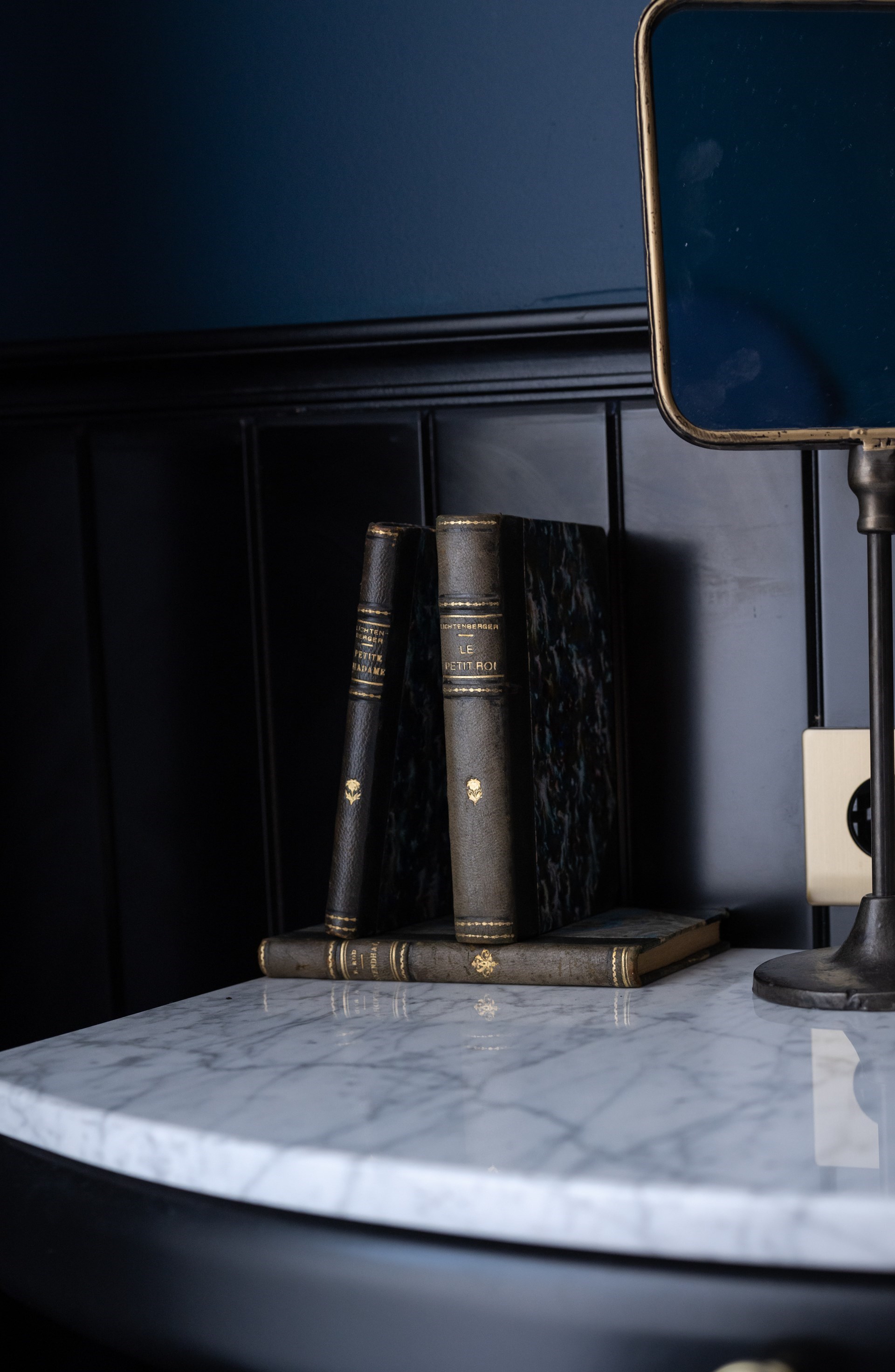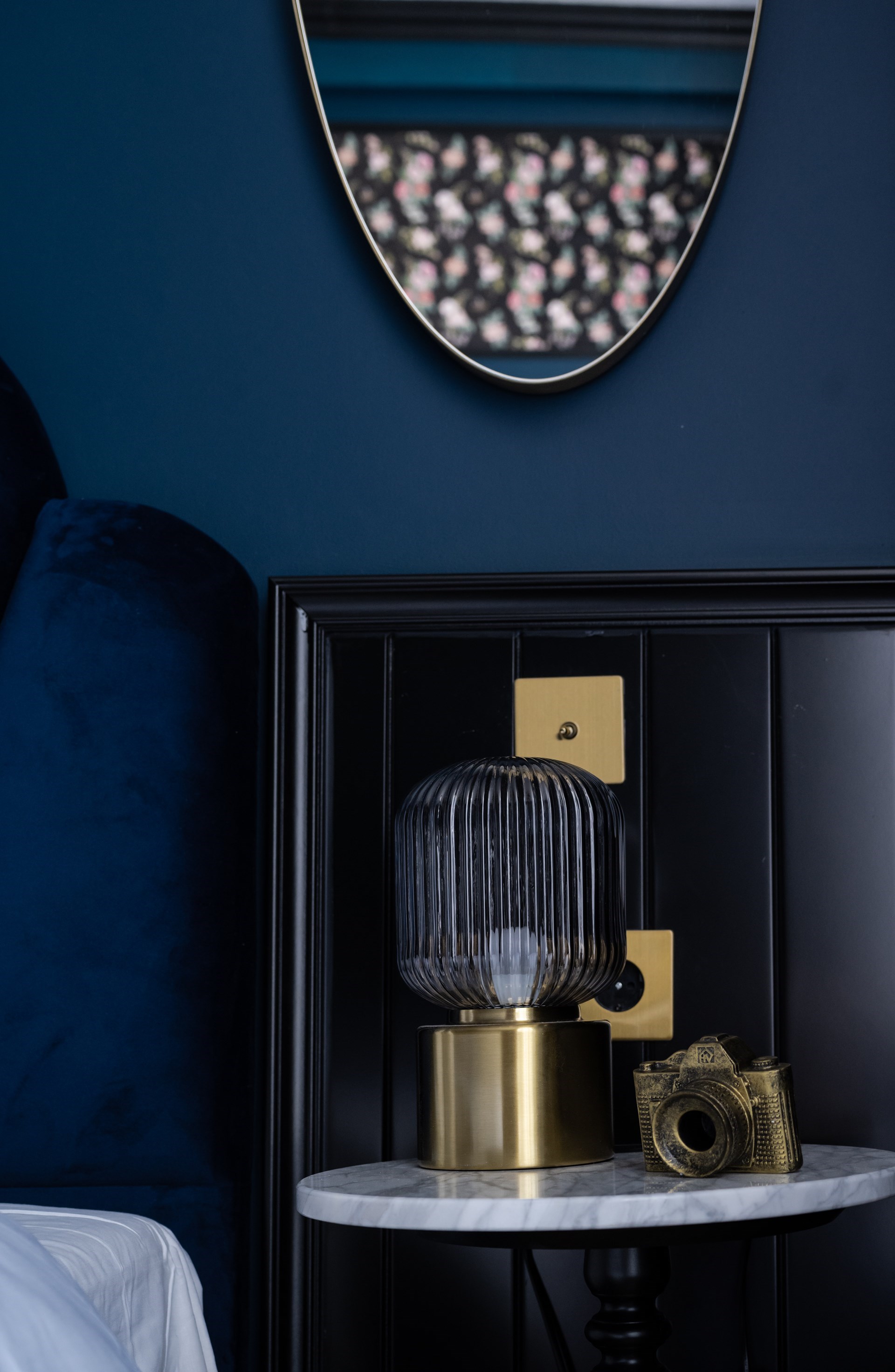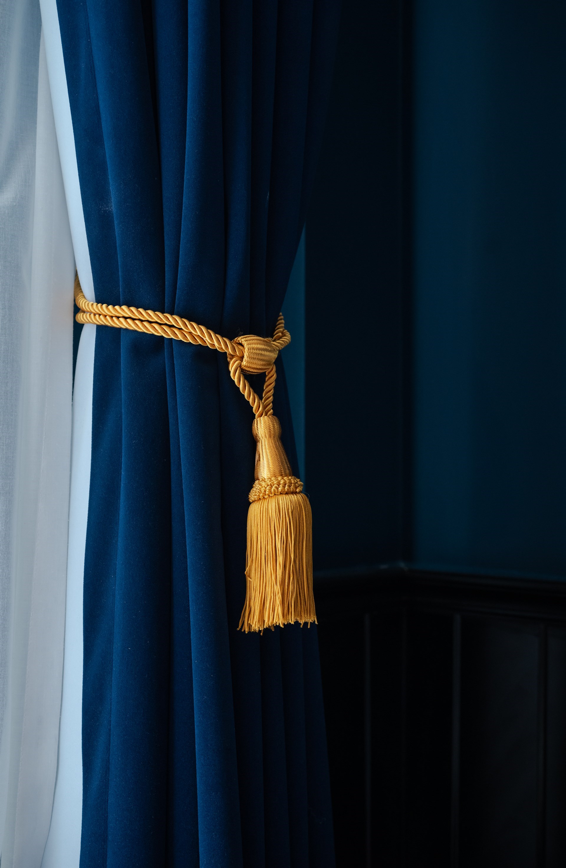 De gangen en kamers van het hotel zijn ingericht in een intens kleurenpalet van zwart en diepblauw, waardoor een sfeer van glamour en comfort wordt gecreëerd. Elke kamer heeft een marineblauw fluwelen bed en hoofdeinde en bijpassende fluwelen gordijnen die de ramen omlijsten, geaccentueerd met contrasterende gouden gordijnkoorden. Tegen het onderste deel van de blauw geschilderde muren zijn klassieke zwarte panelen aangebracht, en bovenaan strekt zich over de hele omtrek een bloemenfries uit. Op de hardhouten vloer liggen tapijten met een blauw dessin. Marmeren oppervlakken en messing accenten maken de look compleet, samen met ondeugende gadgets en vintage accessoires.