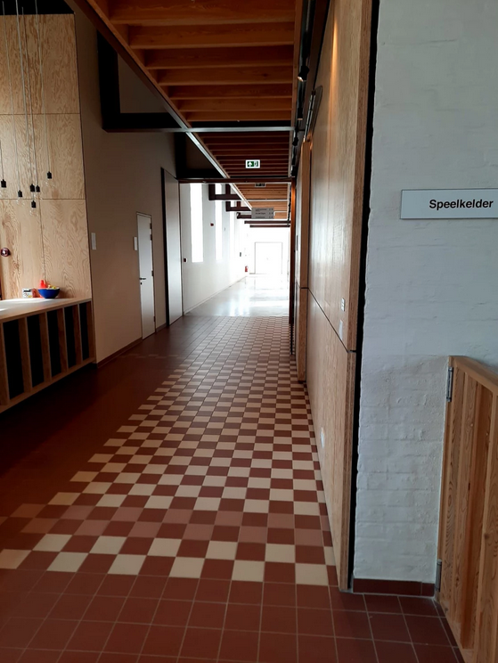 Wanneer het niet mogelijk was om bepaalde oude elementen te behouden, werd er wel af en toe een creatieve verwijzing naar gemaakt. ‘De vloertegels zijn overal rood, maar op de plaatsen waar er vroeger een muur stond zijn de tegels rood en wit.’ Het is dus een soort van kleurencode die je een goed beeld geeft van hoe het gebouw er in de mijnperiode uitzag.