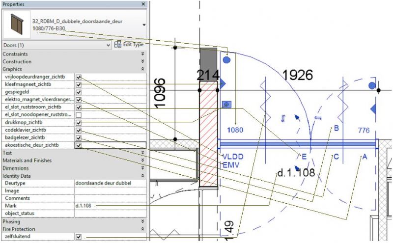 Bijkomend wou de opdrachtgever ook zoveel mogelijk informatie visueel waarnemen. Alle informatie, in dit geval specifiek over de deuren, moest duidelijk zichtbaar op de plannen staan. Daarbij moet men denken aan o.a. kleefmagneten, vrijloopdeurdrangers en badgelezers. Deurcomponenten werden zodanig ontworpen zodat de icoontjes, die overigens in overleg met de opdrachtgever ontwikkeld waren, niet alleen visueel zichtbaar waren, maar ook data triggerden. Het resultaat was een zeer visueel verhelderend plan dat de juiste informatie aan de juiste componenten koppelde.