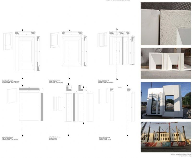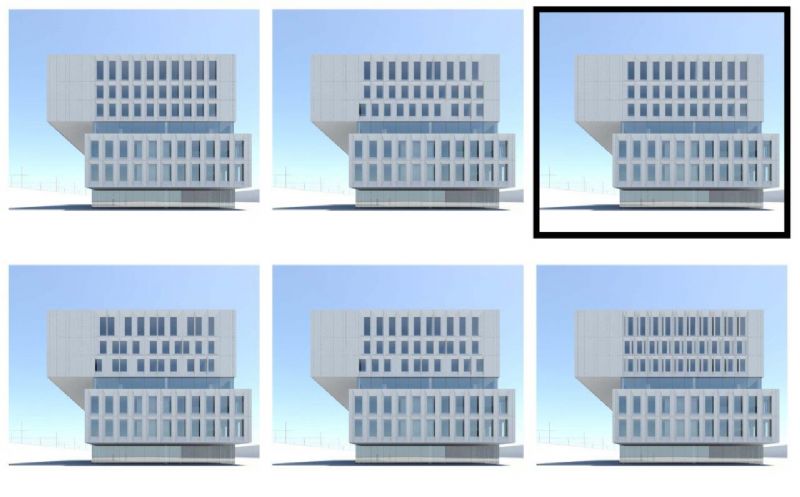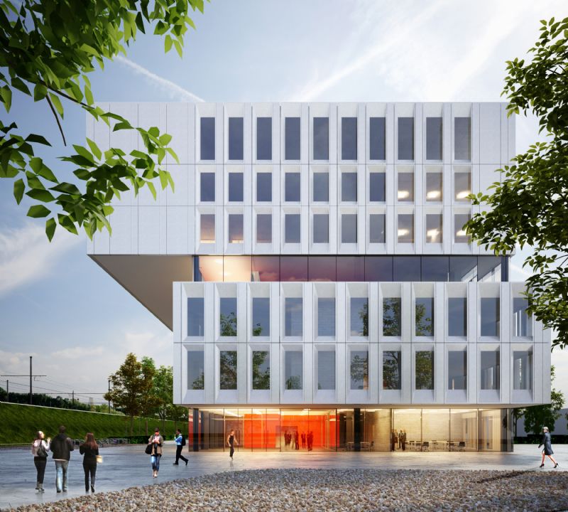 De gevel bestaat uit wit gepolijst beton met schuin geplaatste dagkanten, dit omwille van de architectonische expressie en contrastwerking bij belichting en beschaduwing en een optimale oriëntatie ten opzicht van de zon. Hierdoor ontstaat bovendien een zeer levendig gevelbeeld naargelang de positie die men als toeschouwer inneemt. Het gebouw is eenvoudig aanpasbaar door het gebruik van een kolomstructuur. Het uitbreiden, verkleinen of samenvoegen van lokalen is mogelijk in de toekomst, wat herbestemming ook eenvoudig maakt.