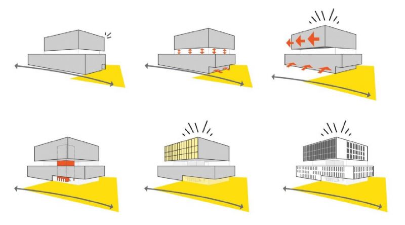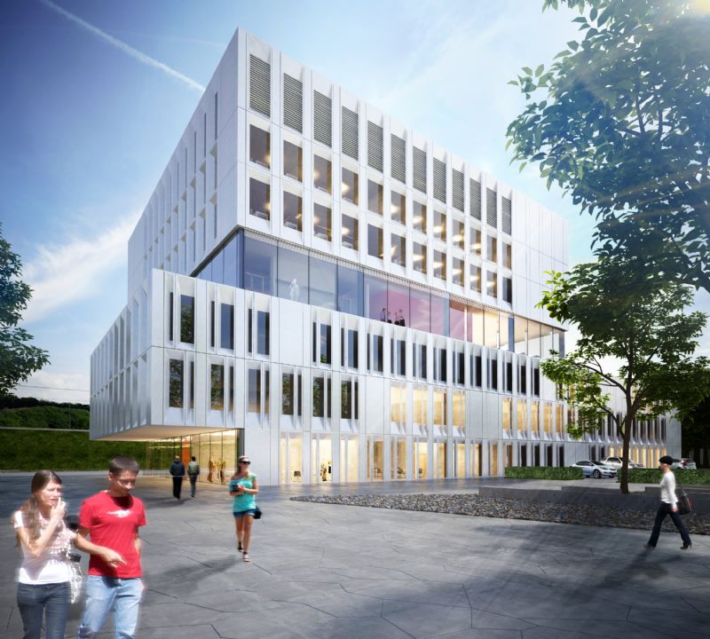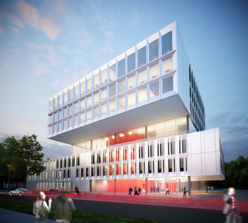 Het gebouw wordt opgedeeld in drie hoofdlagen. Onderaan bevinden zich drie bouwlagen waarin de laboclusters werden ondergebracht. De leslokalen worden in de bovenste lagen georganiseerd en vormen de kop van het gebouw. Tussen deze twee delen bevindt zich een publieke laag. Dit is een transparante laag die fungeert als een opgetild publiek maaiveld.