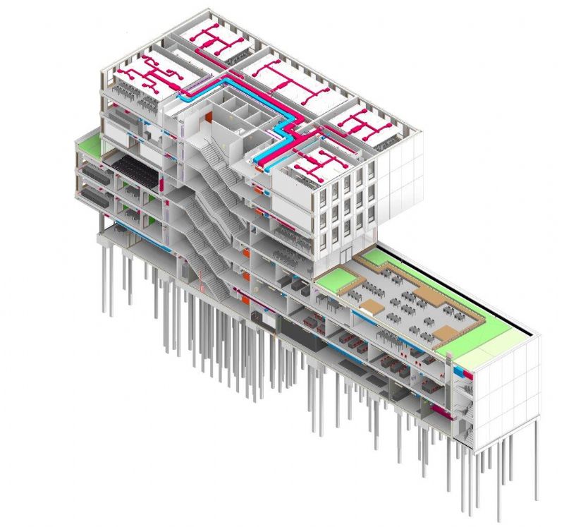 Deze faculteit is het eerste volledig geïntegreerd BIM-project van het team Abscis architecten – Ingenieursbureau Norbert Provoost – Ingenium (API-team). De drie ontwerppartners hadden afzonderlijk al ervaring met BIM-modeling voor het aanvatten van deze opdracht. Het was daarom een evidentie om dit project binnen een BIM-omgeving uit te werken. Net zoals bij eerdere projecten hebben de partners bij dit project nieuwe ervaringen opgedaan. Niet onlogisch, vermits de BIM-software voortdurend evolueert.