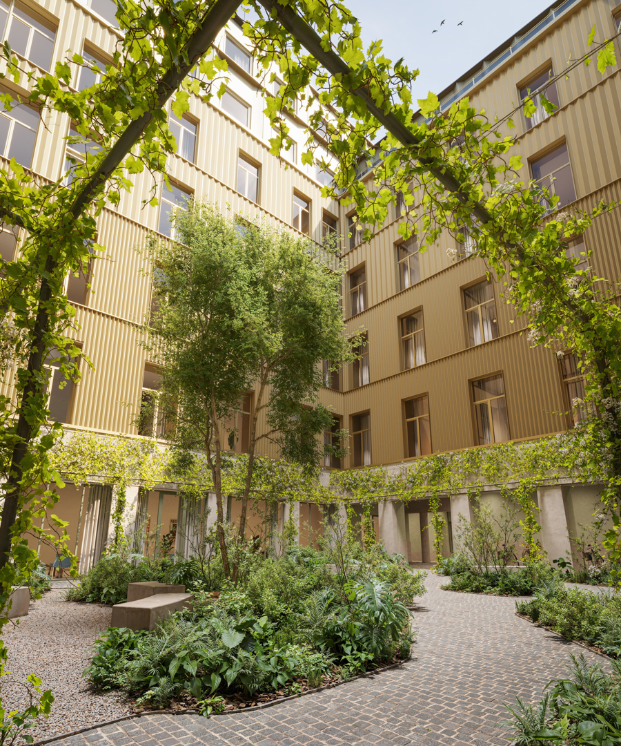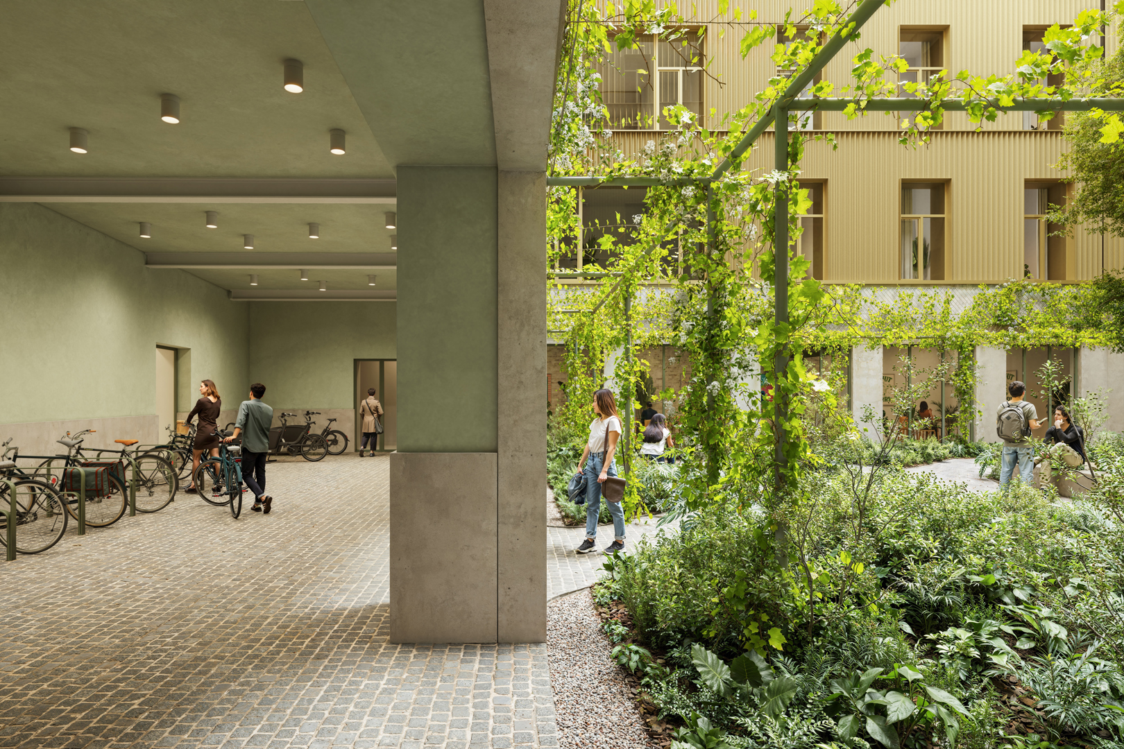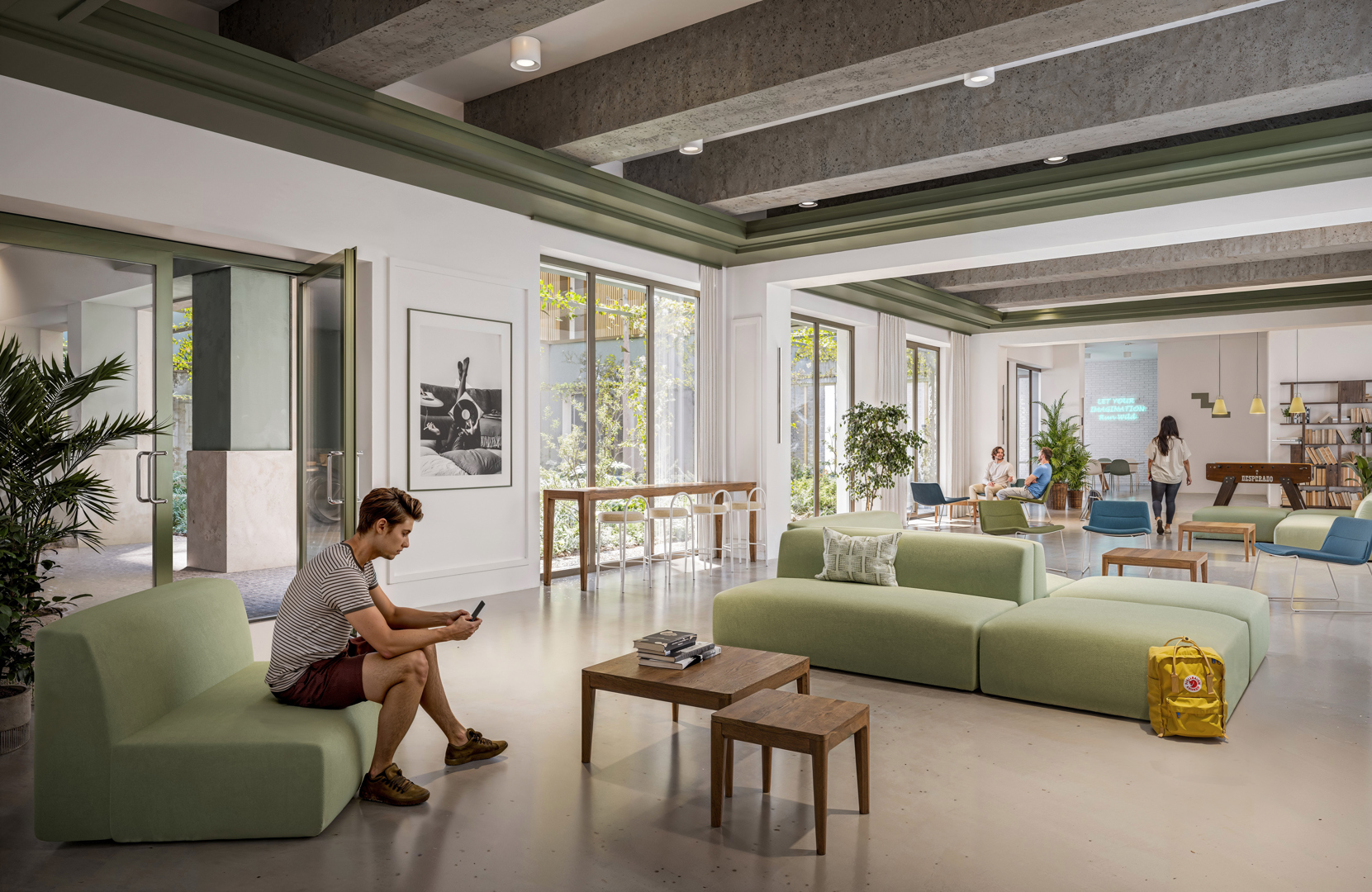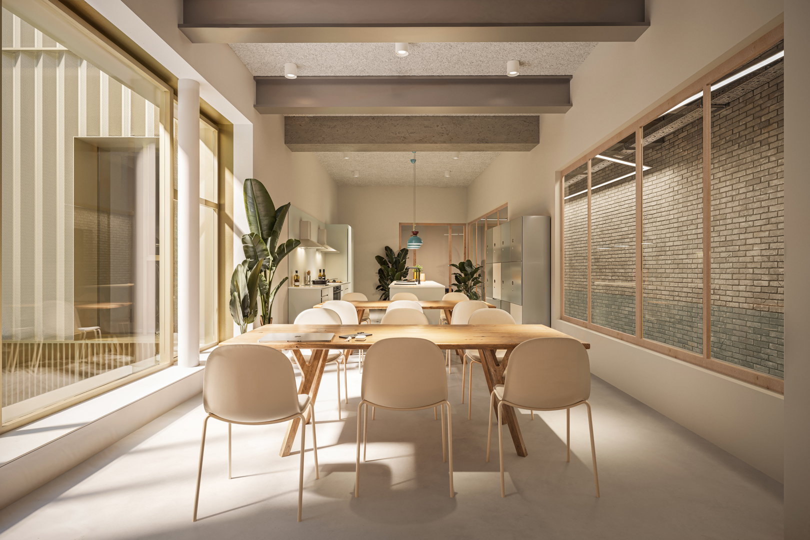 Een tweede ontwerphefboom ligt in het hart van het gebouw: het bestaande atrium met glazen dak wordt niet louter een interne lichtput, maar een geactiveerde plek die het woonprogramma organiseert. “We gaan het atrium opentrekken tot een levendige, groene buitenruimte, waar studenten elkaar kunnen ontmoeten en genieten van rust. Alle gemeenschappelijke ruimtes komen daarop uit,” aldus Cockx. Door die collectieve functies rond het atrium te scharen, ontstaat een duidelijke interne oriëntatie én een microklimaat dat de residentie een eigen ‘buitenkamer’ geeft in de dichte binnenstad. Het atrium fungeert daarbij tegelijk als ontmoetingsplek en als ruimtelijke schakel tussen de verschillende lagen van het voormalige kantoorgebouw.
