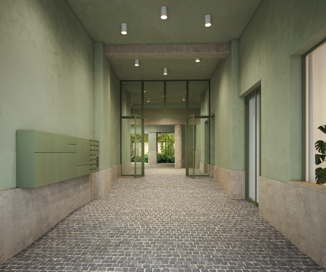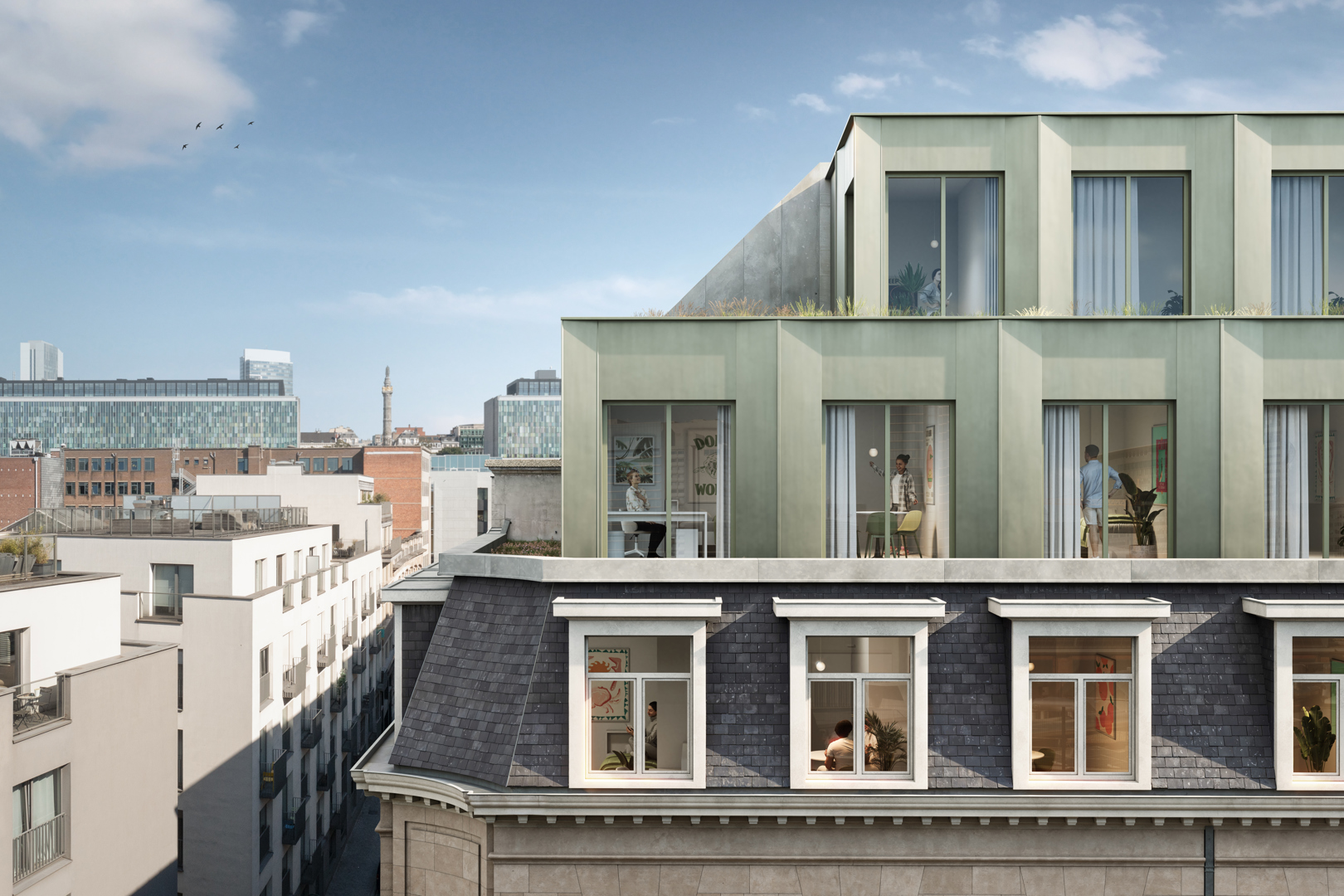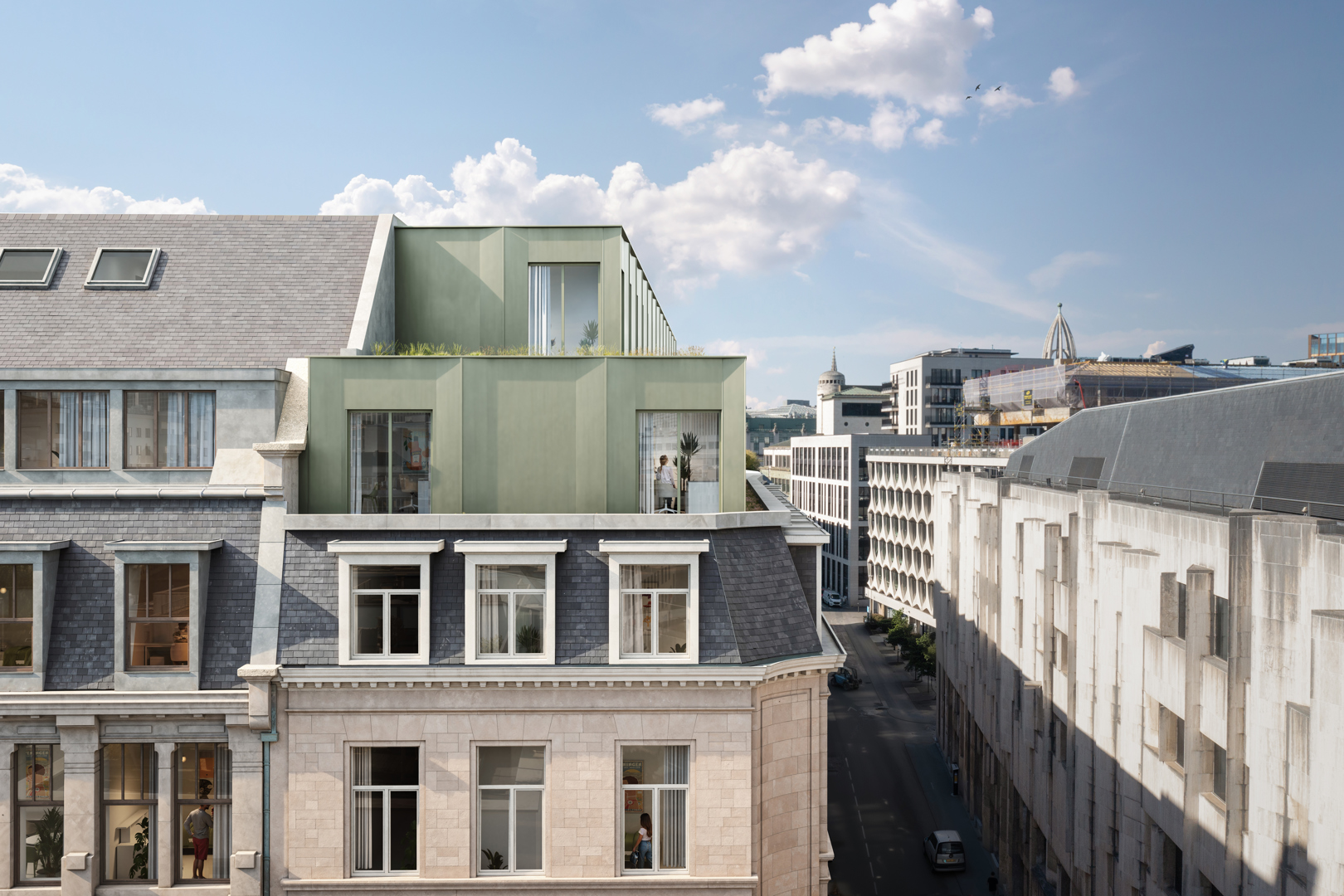 De relatie met de stad wordt expliciet op het gelijkvloers gemaakt, waar LOW inzet op doorwaadbaarheid en publieke leesbaarheid. “Met een soort binnenstraat maken we de verbinding met de straatkant, wat een fantastische stedelijke connector wordt. In plaats van functies bovenin weg te stoppen, houden we ze op het straatniveau,” klinkt het. Die keuze is meer dan een circulatiemaatregel: ze positioneert de residentie als stedelijk adres, waarbij collectieve ruimtes niet verdwijnen in de bovenbouw maar het straatleven mee “aankoppelen”. Als extra laag bovenop het erfgoedvolume komt er bovendien “een panoramisch dakterras met fenomenaal zicht op de stad,” waarmee de bovenste kroon van het gebouw een gedeelde, niet-private bestemming krijgt.