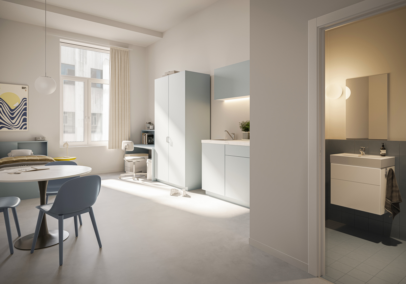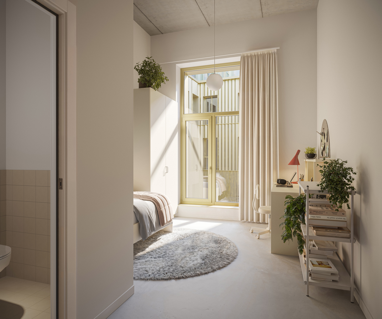 Het Antwerpse ontwerpbureau LOW Architecten vertrekt vanuit de kwaliteiten van de bestaande ruwbouw: hoge plafonds, royale lichtinval en een planlogica die herverkaveling toelaat zonder het karakter te verliezen. Het programma wordt uitgesplitst in 90 kamers (18–26 m²) en 129 studio’s (25–47 m²), telkens met eigen sanitair; de studio’s krijgen bovendien een kitchenette. Die verdeling koppelt compacte privékamers aan zelfstandiger studio’s, terwijl een pakket van 775 m² gemeenschappelijke ruimtes—keukens, zitplekken en studiezalen—de residentie als collectief woonmilieu moet laten werken, ondersteund door een fulltime inwonende conciërge die mee instaat voor beheer en onderhoud.