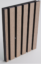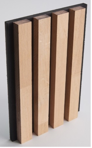 Dit product, Type Ls (Latten op Synthetische kern) met plaatafmeting 3030 x 624 x 22 mm, bestaat uit decoratieve latten van 27x10 mm bekleed met fineer Decospan of HPL, die verlijmd worden op een hoogwaardige zwarte akoestische Bico PET viltplaat van 12mm.