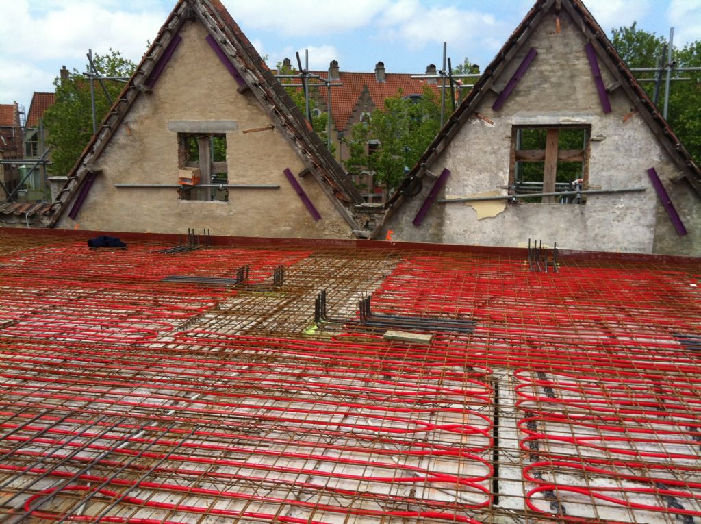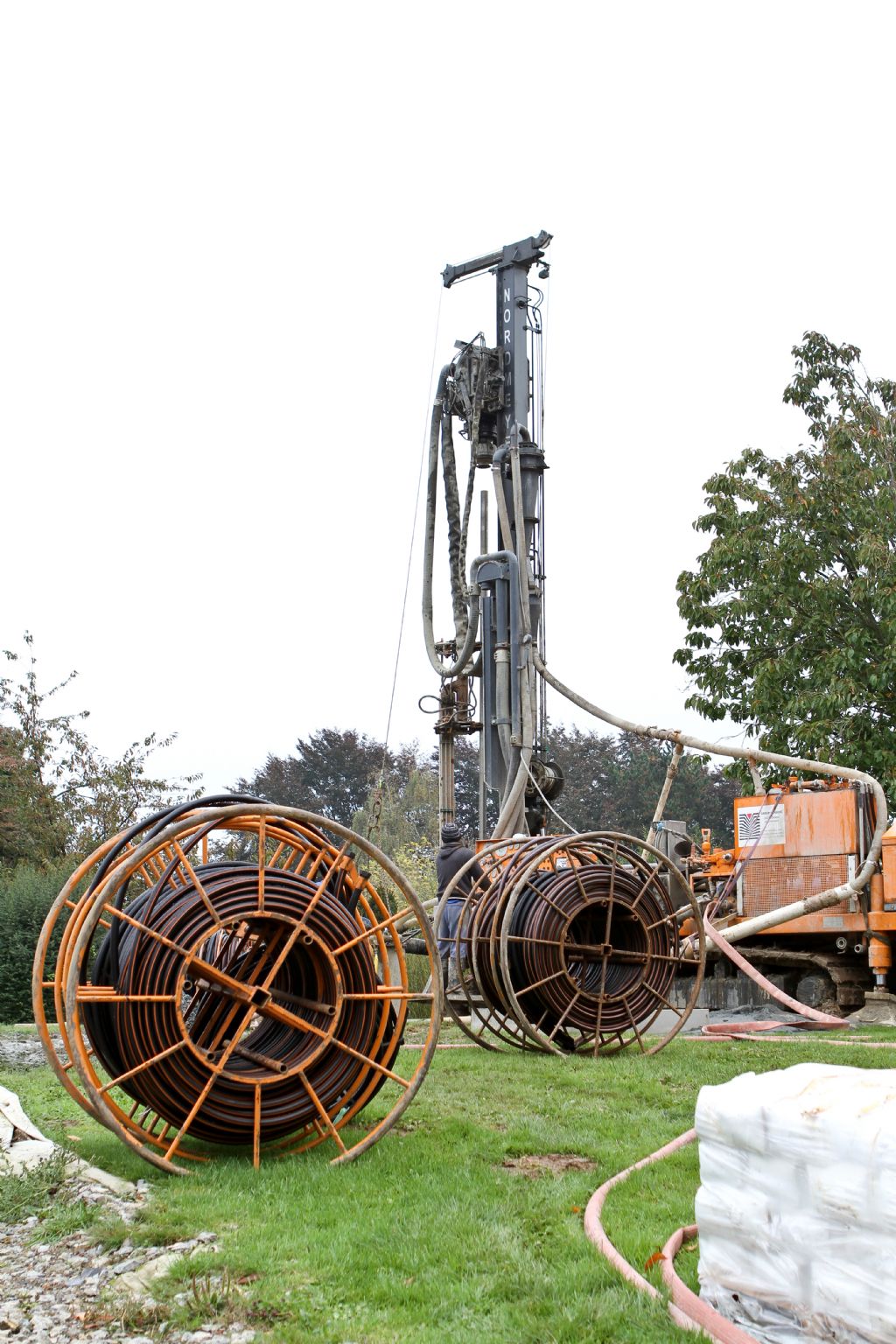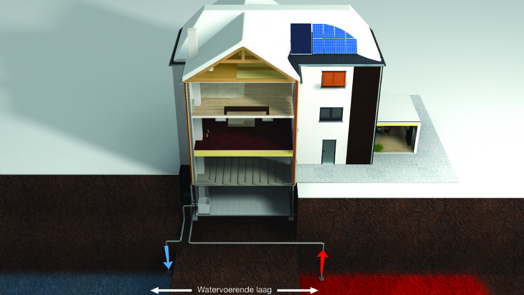 | Hierbij komen zowel ‘open’ geothermische systemen aan bod waarbij grondwater wordt rondgepompt als ‘gesloten’ systemen. Dit laatste systeem bestaat uit een geheel van verticale lussen die tot 150m in de grond worden ingebracht waardoor een water/glycolmengsel stroomt dat de thermische bodemenergie naar boven brengt. In beide gevallen onttrekt een warmtepomp de thermische energie uit het rondgepompt medium en verhoogt de temperatuur tot het gewenste verwarmingsniveau. De koeling van het gebouw gebeurt echter op een ‘passieve’ manier over een eenvoudige warmtewisselaar. De warmtepomp is dan uitgeschakeld. |