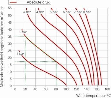 Uit deze grafiek blijkt dat, op het ogenblik dat de installatie gevuld wordt met water van 20°C tot op een druk van 2 bar, er tegelijkertijd met elke kubieke water, maximaal 35 liter opgeloste lucht de installatie in gaat. Gaat men nu het water opwarmen tot op 80°C dan kan er nog maar maximaal 18 liter lucht opgelost zijn in het water en wat tot gevolg heeft dat er 17 liter lucht vrij komt.