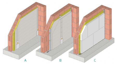 A. Op de basiswand gekleefde systemen die bestaan uit een soepel poreus materiaal (veelal minerale wol of geëlastifieerd EPS) dat voorzien is van een plaatmateriaal (veelal gipsplaat) of pleisterlaag als afwerking. Gekleefde systemen op basis van stijve isolatieplaten (EPS, PU, XPS, …) kunnen niet beschouwd worden als akoestische voorzetwanden vermits deze de geluidsisolatie van zware basiswanden verzwakken in plaats van verbeteren