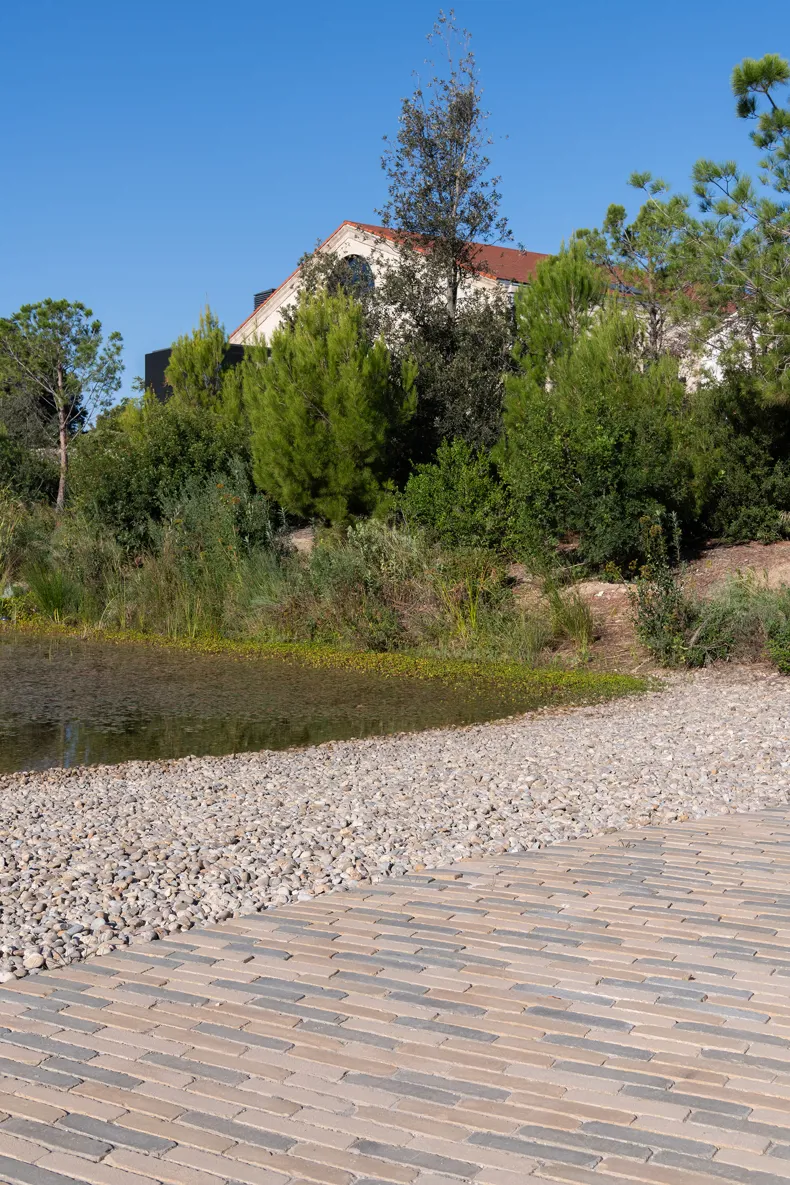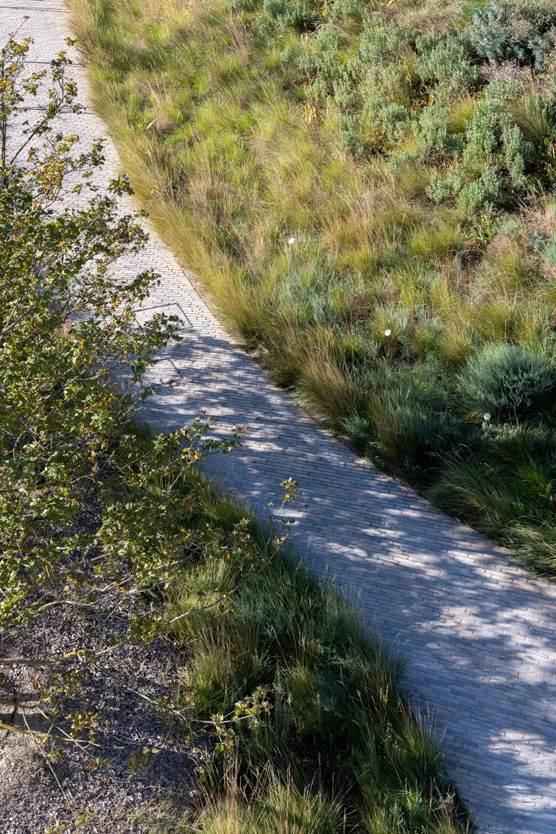 Bezoekers kunnen via organisch gevormde paden van kleiklinkers door deze inspirerende omgeving wandelen. Voor deze paden werd gekozen voor de SeptimA kleiklinker in ECO-7-SIZE, in drie verschillende kleuren. Deze specifieke mix van grijze en gele klinkers creëert een kleurenpalet dat perfect aansluit bij de omgeving van het park, wat zorgt voor een eenheid in het ontwerp.