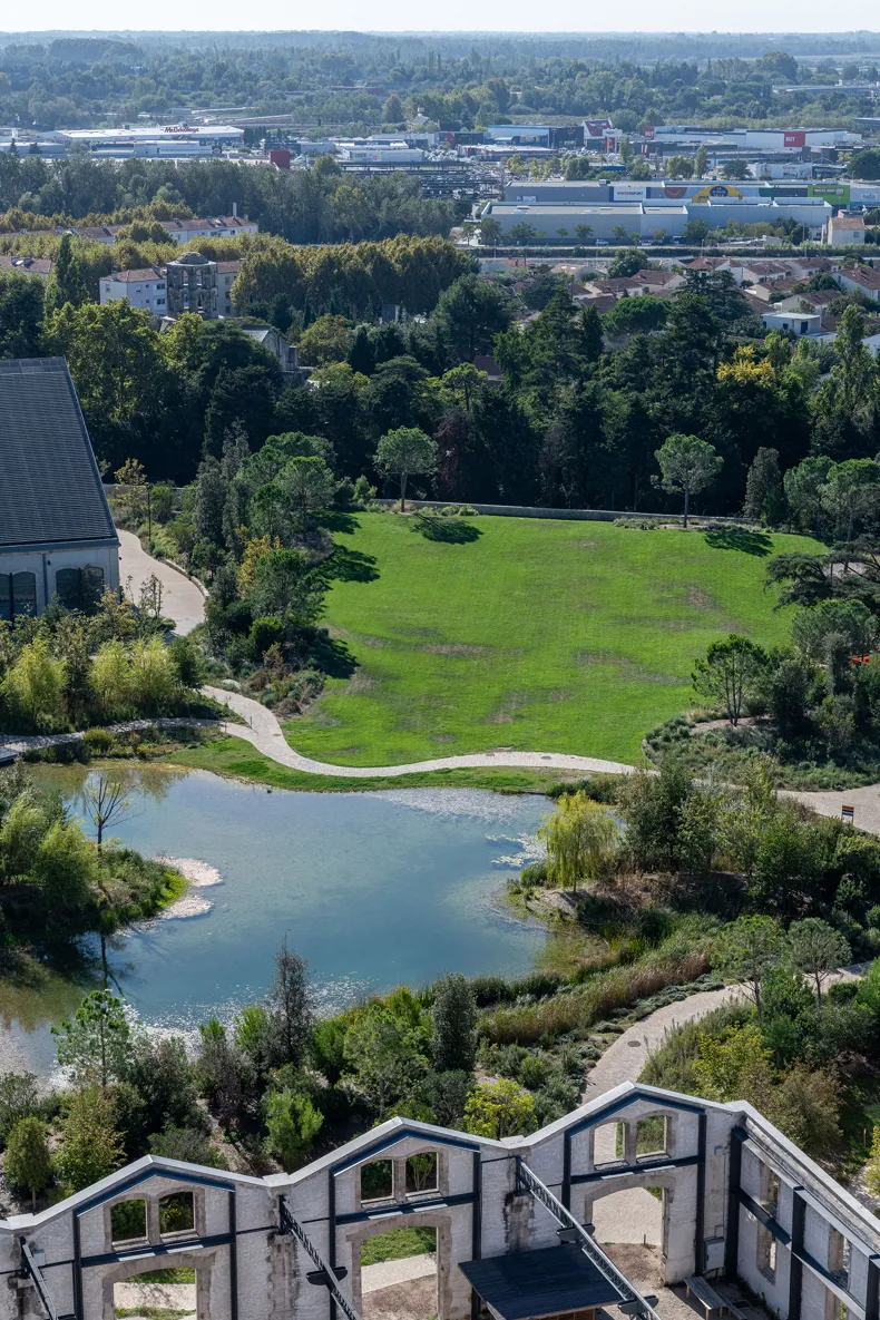 Om begroeiing mogelijk te maken werd vruchtbare grond op het kale beton gelegd, wat een nieuwe topografie creëerde, alsof het gebeeldhouwd was door de winterse mistralwinden. Deze asymmetrische vorm zorgt voor schaduw in de zomer en bescherming tegen de winterse winden. De vegetatie wordt ondersteund door een duurzaam watercirculatiesysteem dat water uit het nabijgelegen Craponne-kanaal gebruikt. Een grote centrale vijver dient als waterreservoir voor irrigatie en verkoeling, wat een microklimaat creëert en de voormalige betonwoestijn verandert in een aangenaam park.