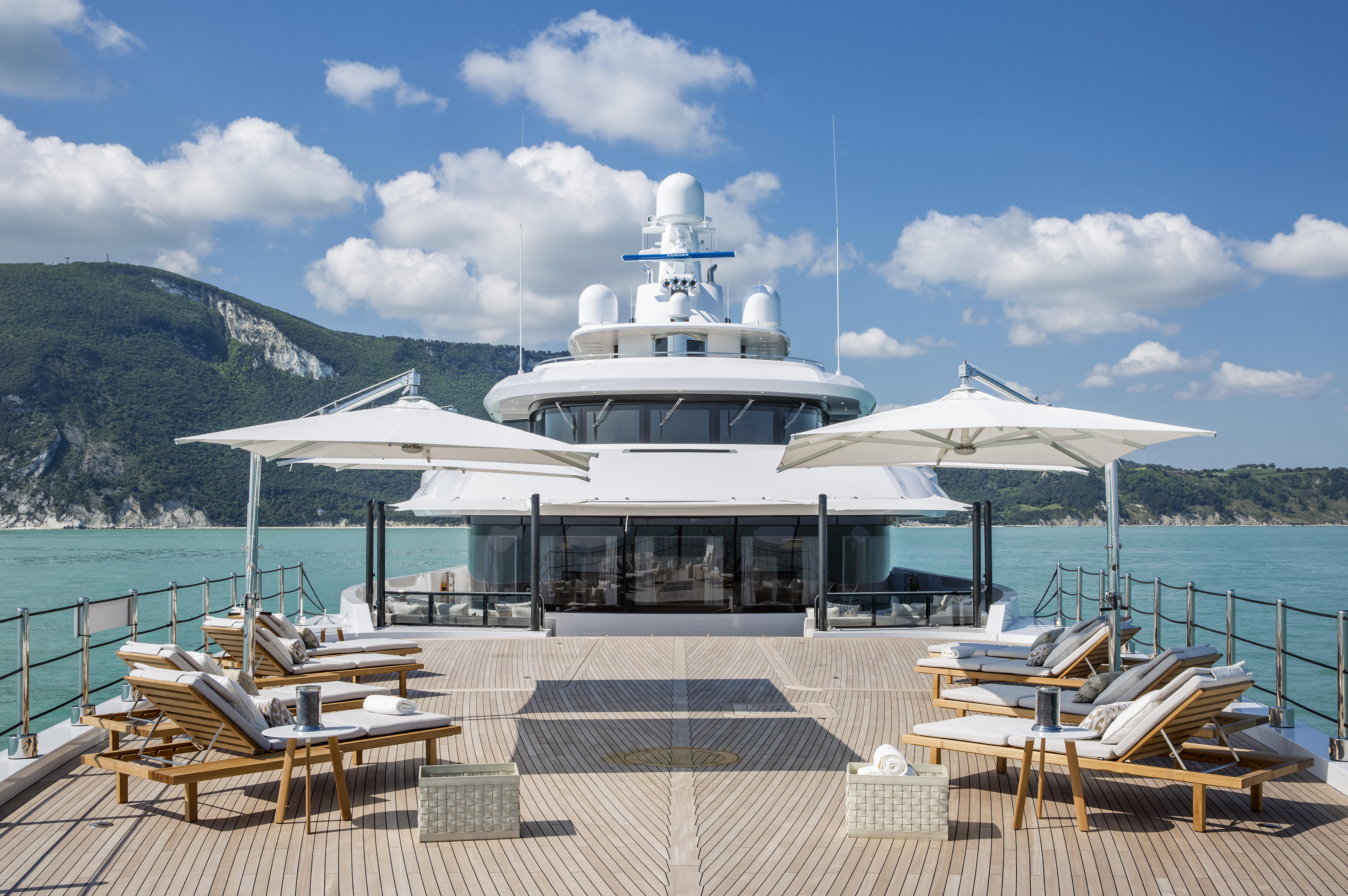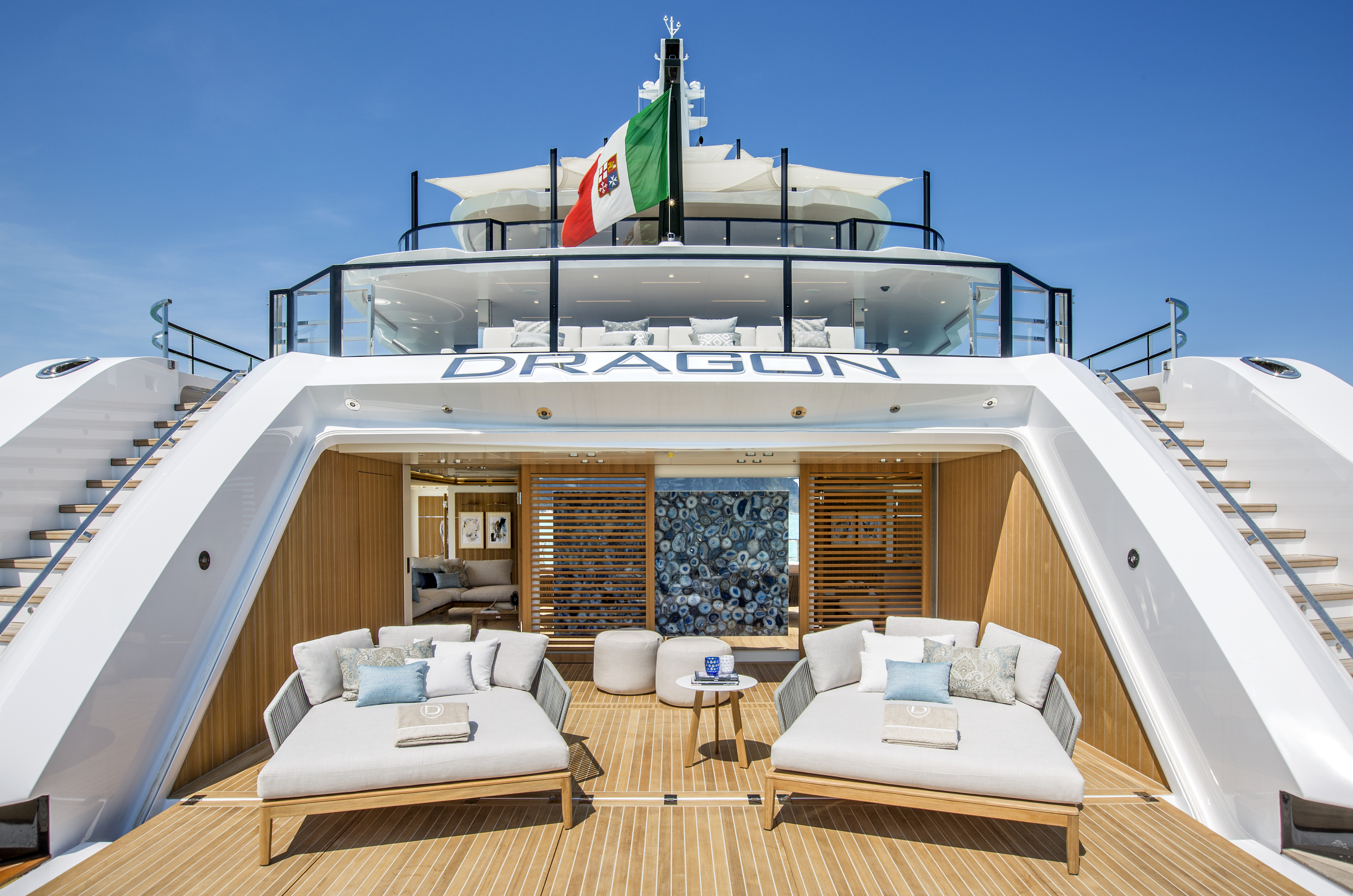 Zes dekken telt het grote schip. Elk van hen is bedekt met strakke lijnen die kamers creëren voor twaalf gasten en negentien bemanningsleden. Voor de inrichting van de buitenruimtes stond Francesco Guida aan het roer. De interieurontwerper heeft al meer dan dertig jaar ervaring met schepen en was een van de eersten om een superjacht te voorzien van een duurzame aankleding. Uit een zee van merken koos Guida voor Tribù, bekend van tuinmeubelen. De stukken die hij uit verschillende collecties viste, gaan volgens hem namelijk perfect bij de binnenkant van ‘M/Y Dragon’.