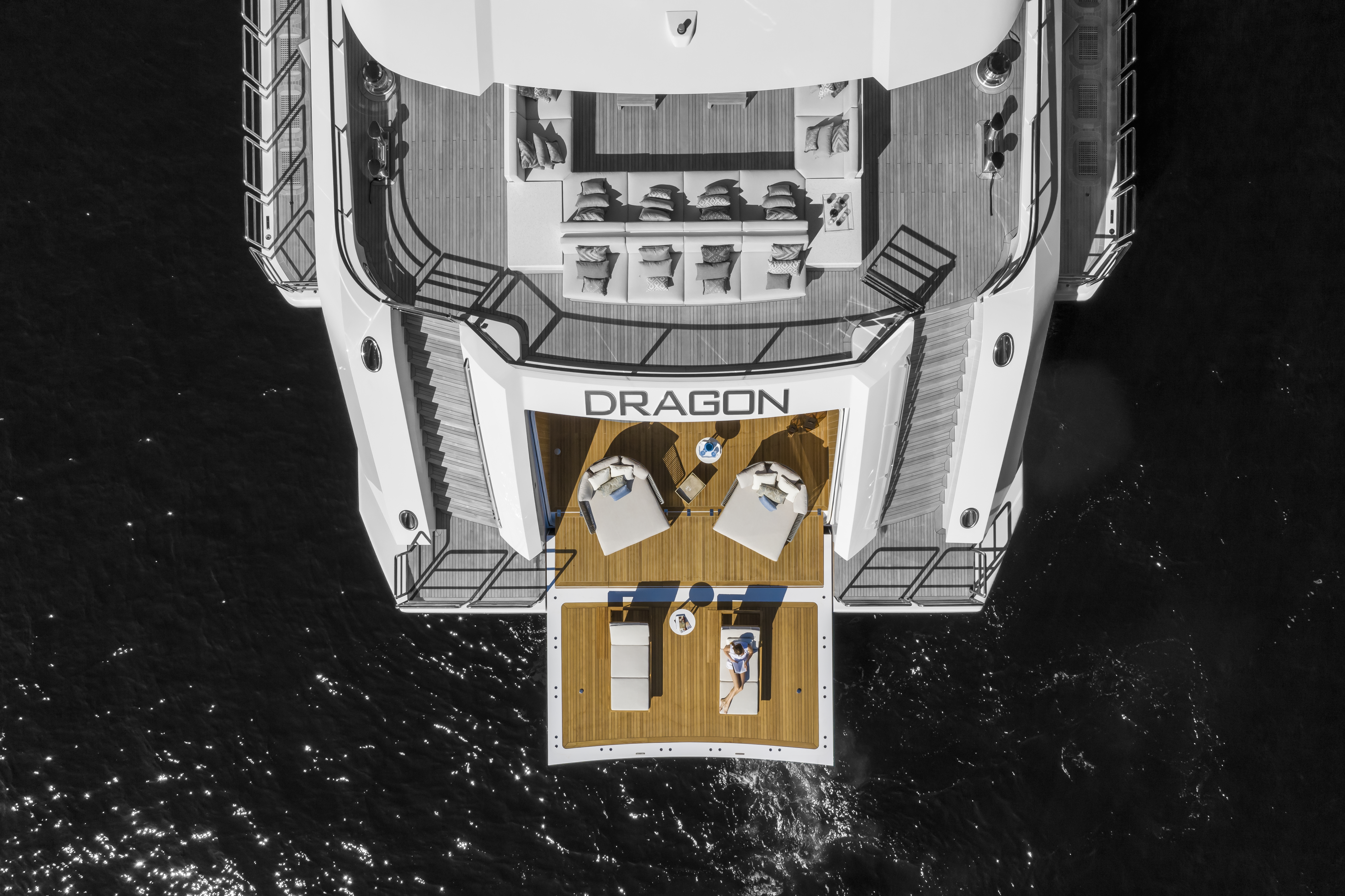 Wanneer Dragon voor anker ligt, schuiven er aan de boeg extra zonnedekken open die ingericht zijn met ‘Mood’-daybeds, ‘Vis à Vis’-ligbedden, poefs en ‘Ile’-bijzettafels. Bovendien kunnen de zon- en zeewaterbestendige stoffen tegen een stootje, wat de weersomstandigheden ook zijn. Over de hele breedte van de teakhouten brug is een soort van ‘strandclub’ voorzien. De ruimte van 200 m² beschikt over een cocktailbar en zitgedeelte. Hier heeft Guida de ‘Mood’-barstoelen met ‘Pure’-sofa's, ‘Mood’-salontafels en poefs gecombineerd om een ontspannen sfeer op te roepen.
