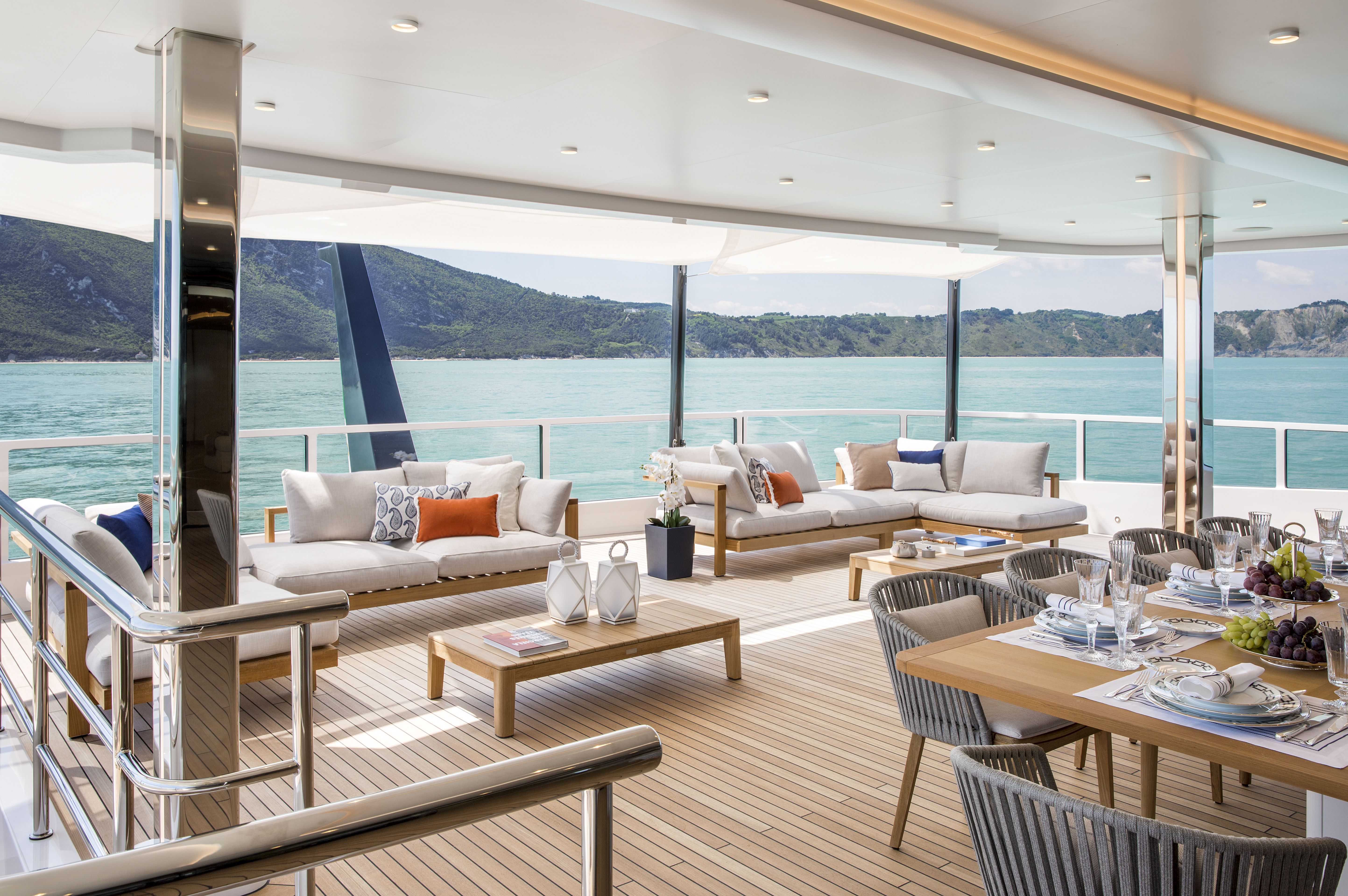 “Het interieur is geïnspireerd op de Provençaalse stijl, maar dan met een moderne toets”, vertelt Guida. “Het handgeweven vlechtwerk in de rugleuning van de ‘Mood’-armstoelen, daybeds en clubzetels past bijvoorbeeld bij de natuurlijke sfeer die ik wilde creëren. De moderne en tegelijkertijd klassieke uitstraling van het interieur loopt sierlijk over in de buitenruimtes, wat het jacht een tijdloze en ontspannen sfeer geeft.”