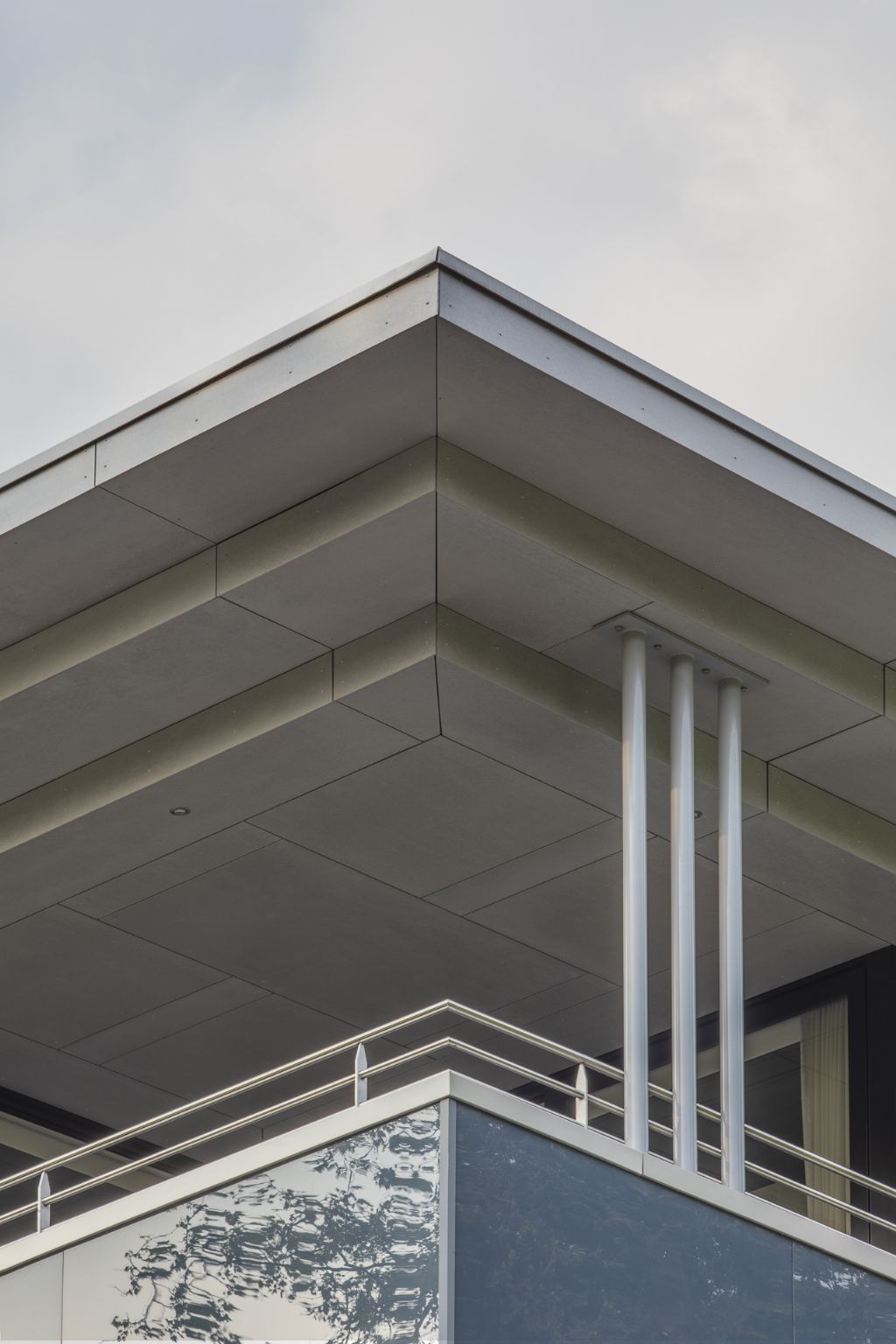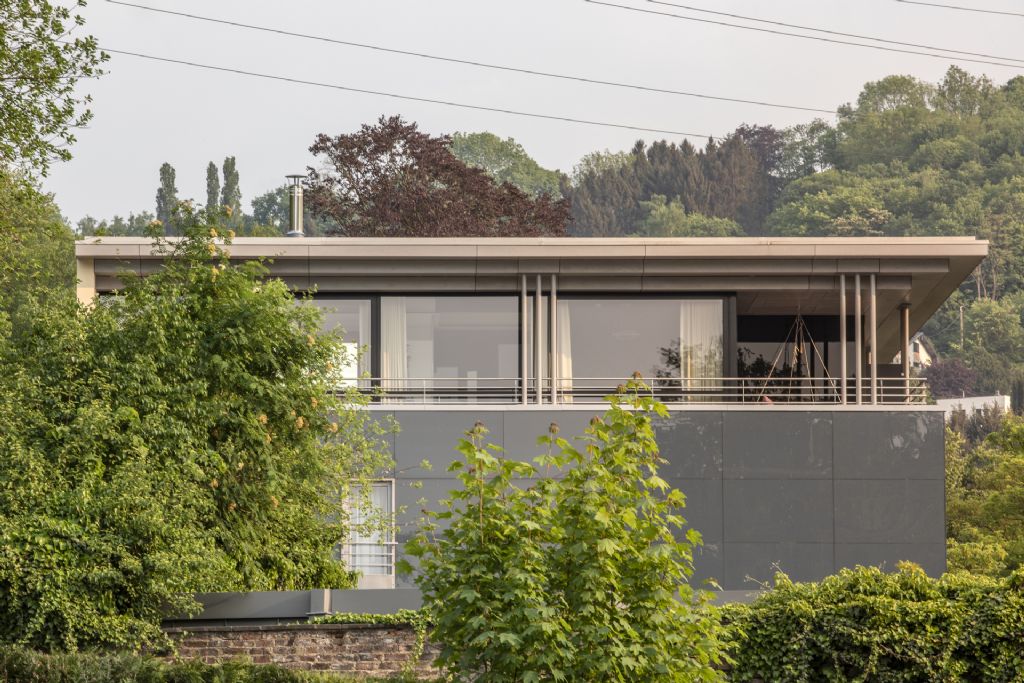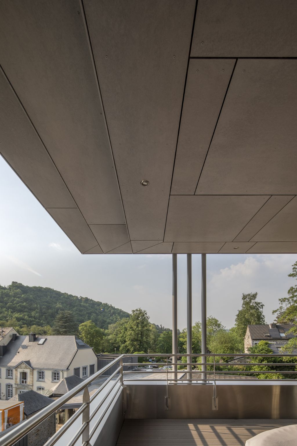 Voor de plafond afwerking van de ruime terrassen is er gekozen voor de Colormat Classic gevelplaat van SVK. Daarbij is er specifiek geopteerd voor de grijze kleur H402 Slate. Deze in de massa gekleurde gevelplaat bleek voor de architect Monsieur Conradt de perfecte keuze te zijn. Dat gezien de mooie integratie met het reeds bestaande gebouw alsook de omgeving rondom.