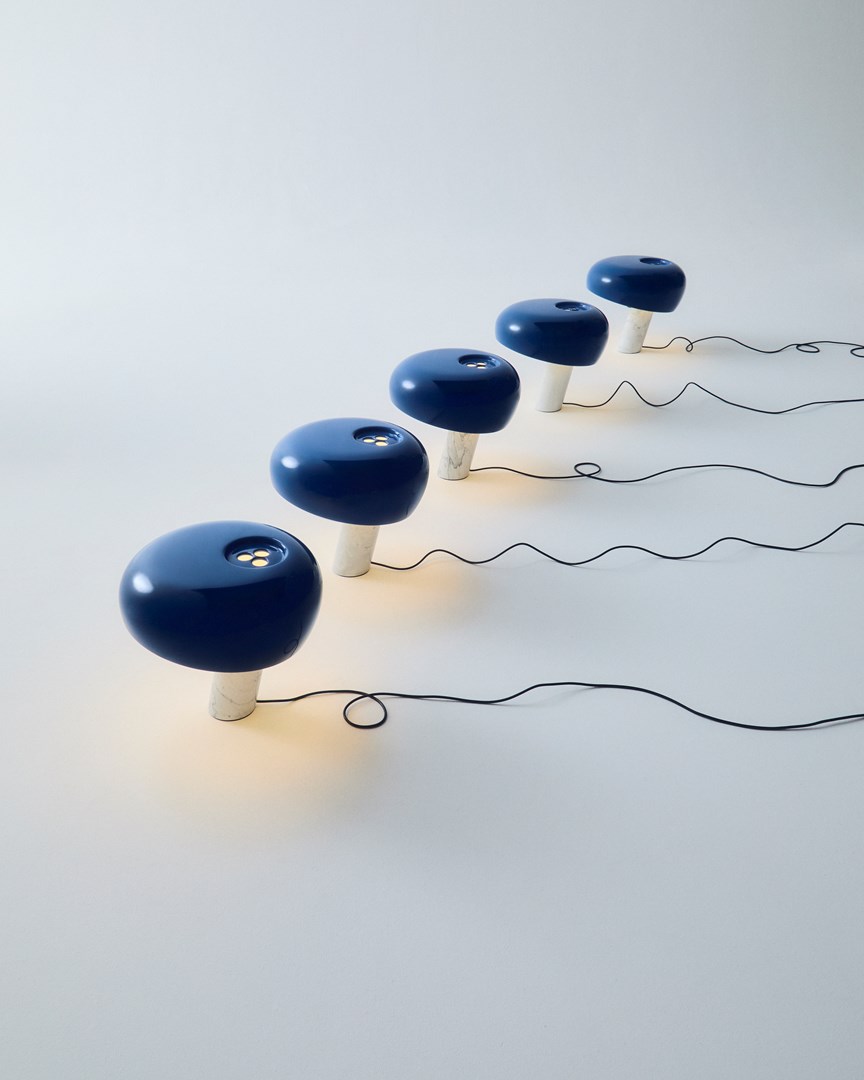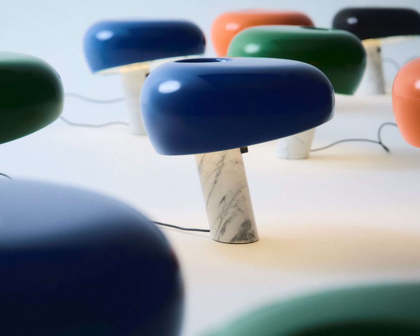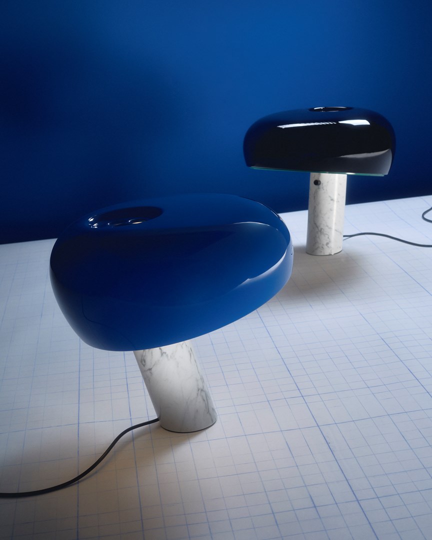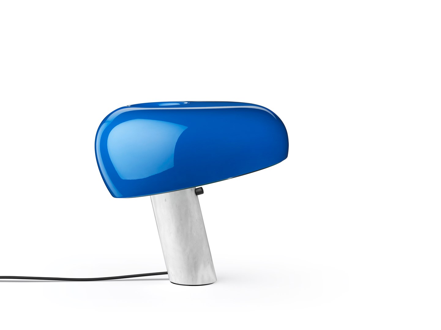 De legendarische tafellamp Snoopy, een van de meest originele en ironische ontwerpen in de geschiedenis van de verlichting, werd in 1967 ontworpen door Achille en Pier Giacomo Castiglioni. In de loop der jaren heeft verlichtingsmerk Flos de kenmerkende zwarte geëmailleerde metalen kap van Snoopy uitgebreid met een gedurfd kleurenpalet, waaronder oranje en groen. Vandaag is de collectie verrijkt met een opvallende marineblauwe afwerking. Deze nieuwe kleur is geïnspireerd op de Sciuko-lamp uit 1966 van de Castiglionis, een veelzijdige spot die populair werd door zijn rijke kleurvarianten.