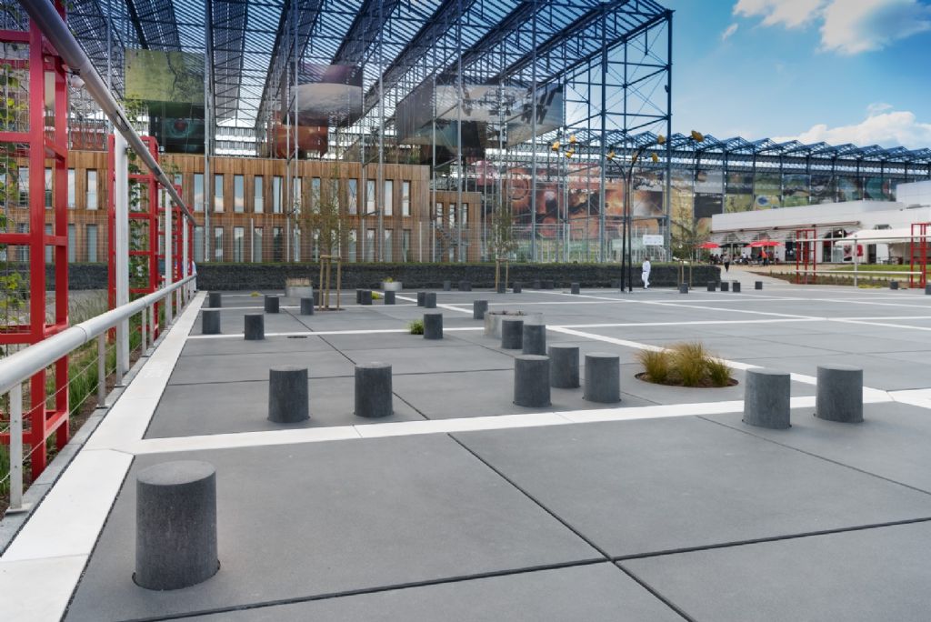 Zowel de muurelementen, de grootformaattegels als de zowat veertig zitelementen zijn op maat gemaakt in architectonisch beton. Daardoor passen ze perfect bij de granietgrijze uitgewassen betonstraatstenen. De aard en de kleur van de materialen staan uiteraard centraal in dit project aan de voet van dit werelderfgoed. Wegens de sterke aanwezigheid van het beton (tegels, straatstenen, muurtjes en banken) heeft Agua geopteerd voor een kleurenpalet dat trouw blijft aan het typische karakter van de site.