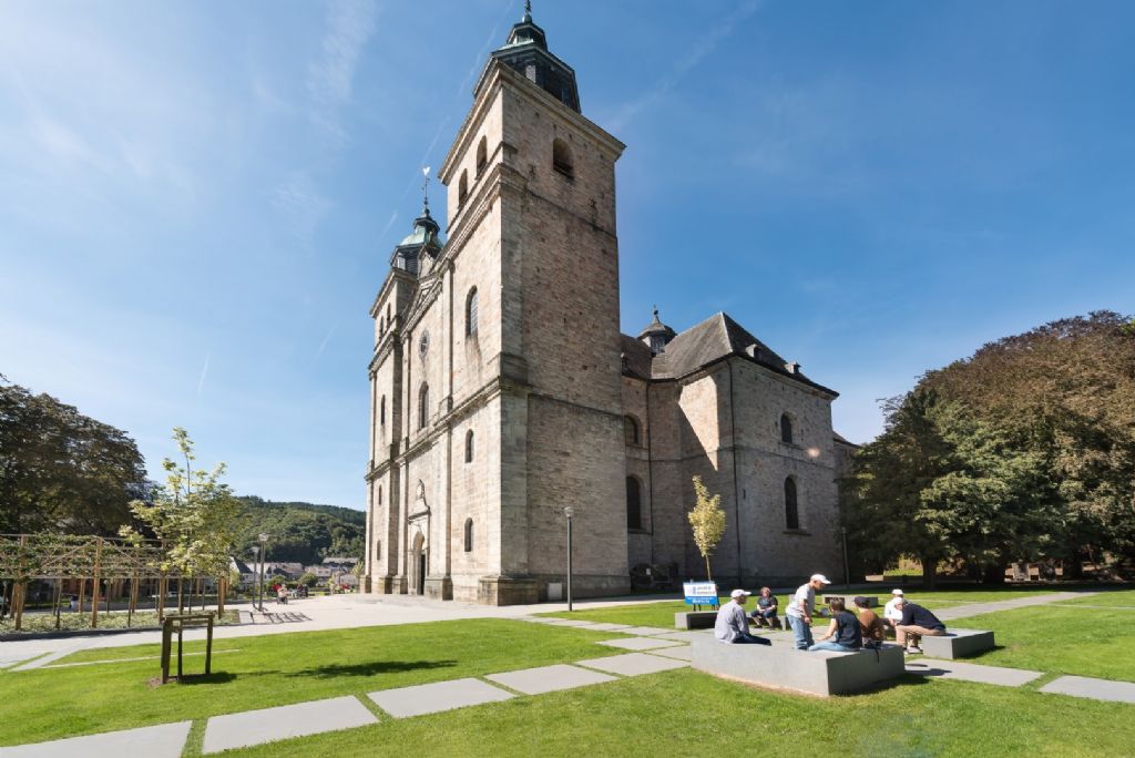 Zo geven de muurtjes in architectonisch beton aan de voorkant van de abdij de plaats aan waar vroeger een vleugel van het voormalige klooster van Châtelet lag. Aan de achterkant van de kathedraal is er met lineaire elementen een verwijzing naar de voormalige kerk uitgewerkt, ook in architectonisch beton. Het verkeer op het plein werd verhuisd en het plein is nu autovrij. De hoofdroutes in granietgrijze Saxum straatstenen verzekeren de continuïteit met de inrichtingen van het centrum van Malmedy. De secundaire routes in donkergrijze betontegels in groot formaat zorgen dan weer voor een visuele aansluiting tussen de verschillende toegangspunten naar de gebouwen errond en geven de site een moderne toets.