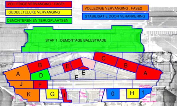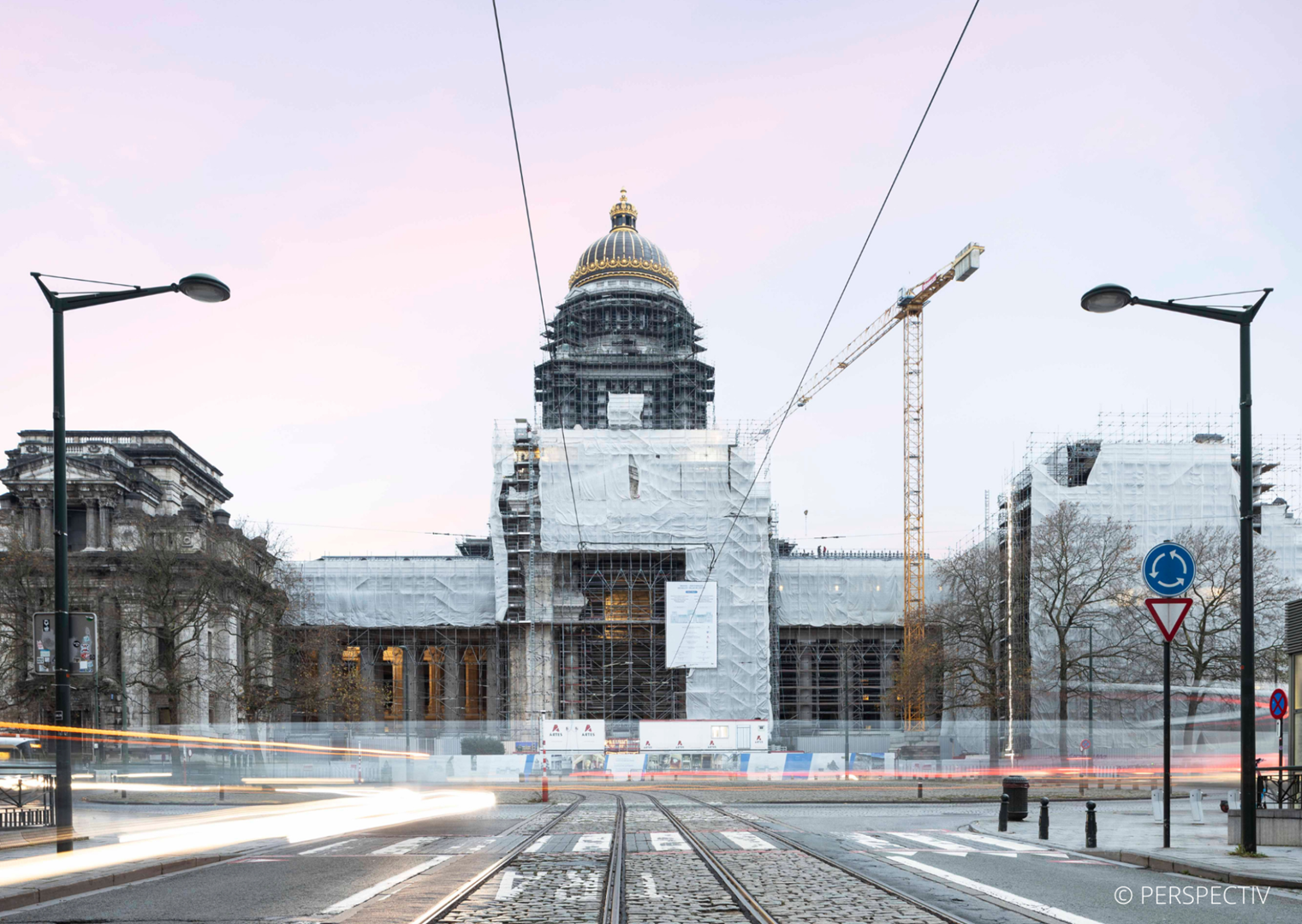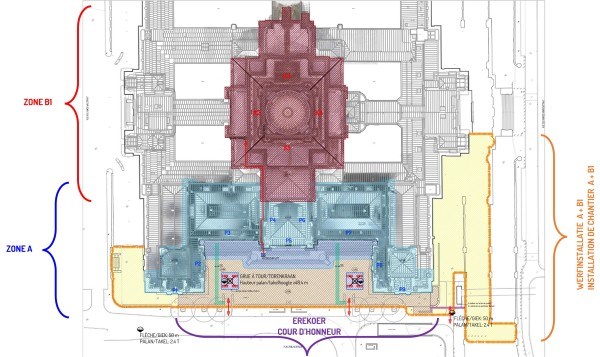 De omvang van het gebouw vereist een gefaseerde aanpak, beginnend met de voorgevel aan het Poelaertplein. De restauratiewerken omvatten uitgebreide stabiliteitsstudies en de aanpassing van steigers om veilige werkomstandigheden te garanderen. Deze steigers, essentieel voor zowel inspectie als constructie, zijn versterkt en uitgebreid om te voldoen aan de huidige behoeften van het project.